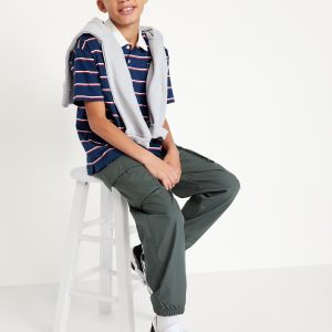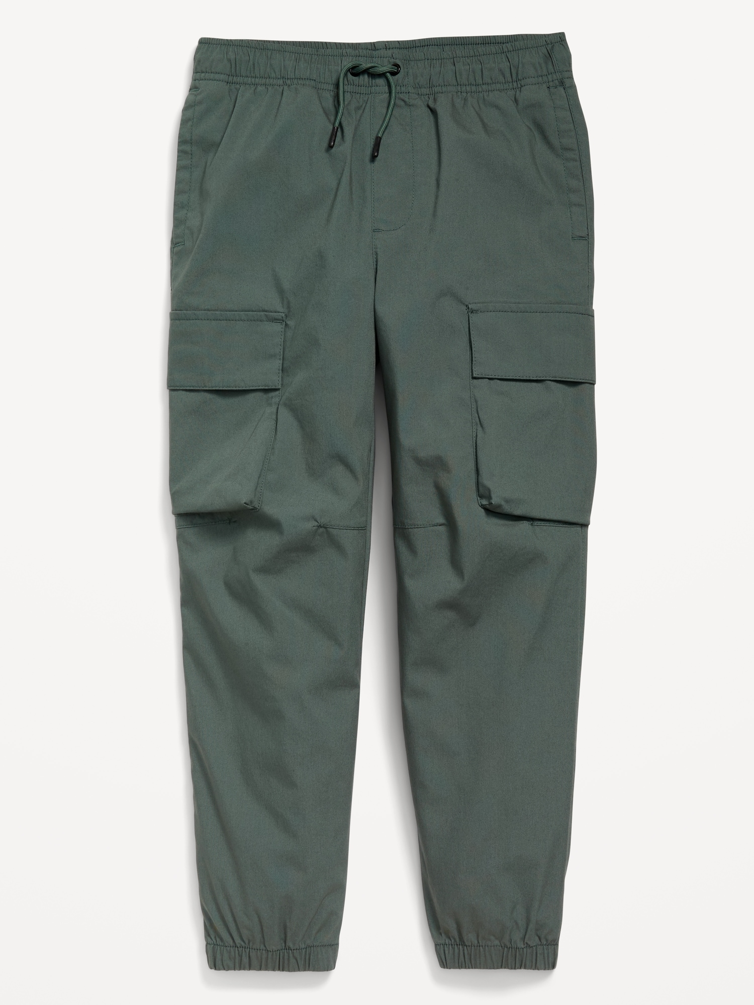 Baggy Cargo Pants for Boys: elasticized waist, functional drawstring, on-seam pockets, single welt pocket at back, adhesive secure-close cargo pocket at each leg, cinched leg cuffs, #565426