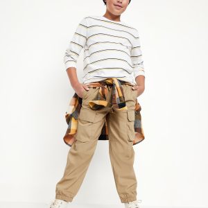 Baggy Cargo Pants for Boys: elasticized waist, functional drawstring, on-seam pockets, single welt pocket at back, adhesive secure-close cargo pocket at each leg, cinched leg cuffs, #565426