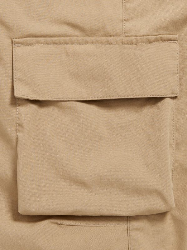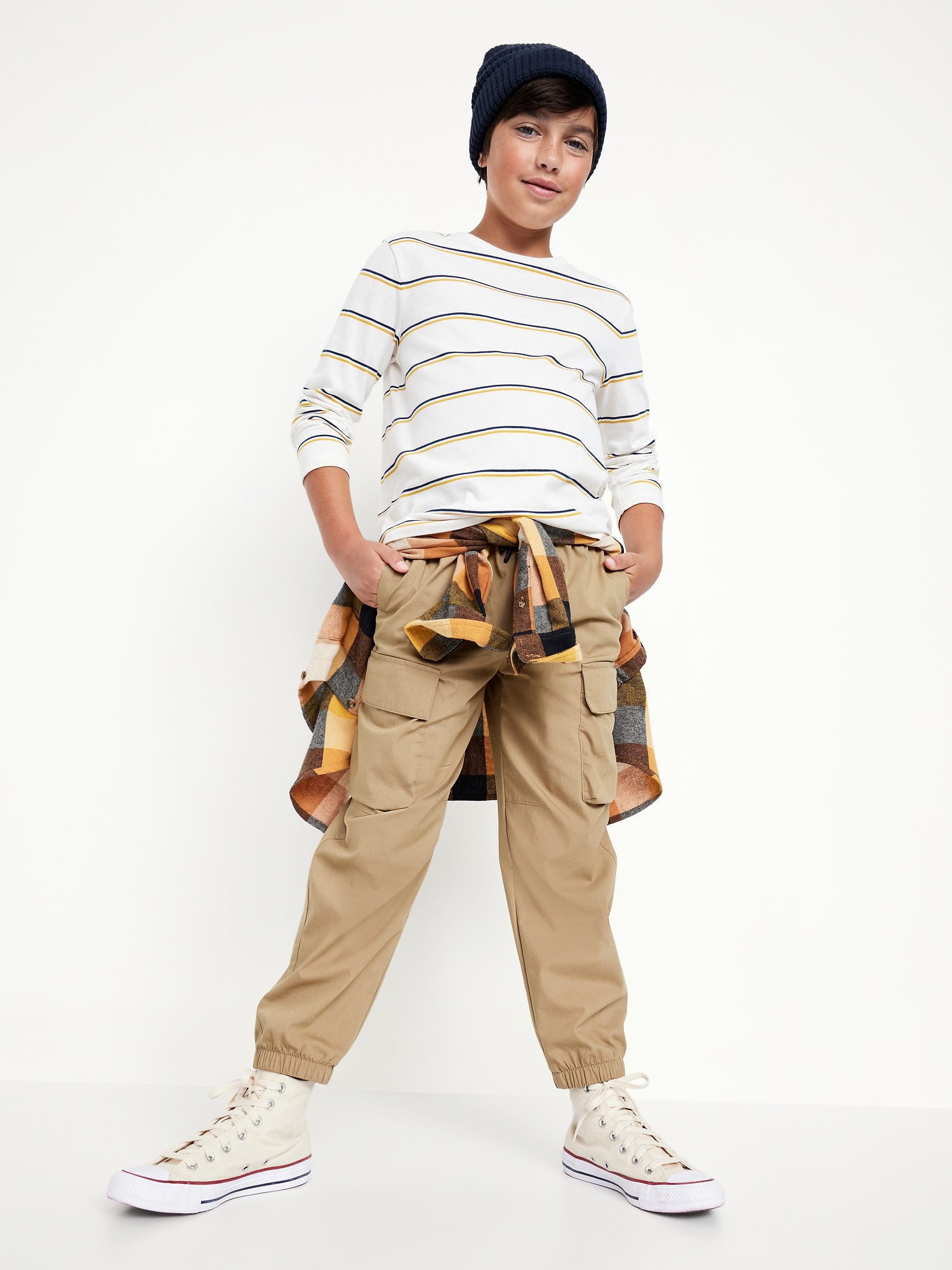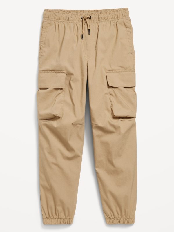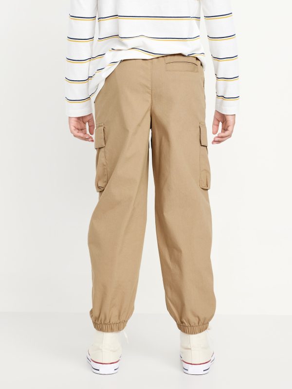 Baggy Cargo Pants for Boys: elasticized waist, functional drawstring, on-seam pockets, single welt pocket at back, adhesive secure-close cargo pocket at each leg, cinched leg cuffs, #565426