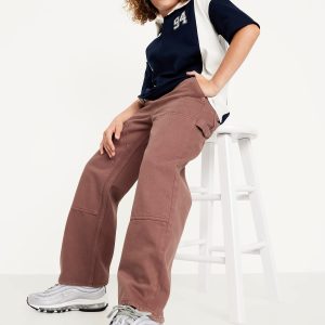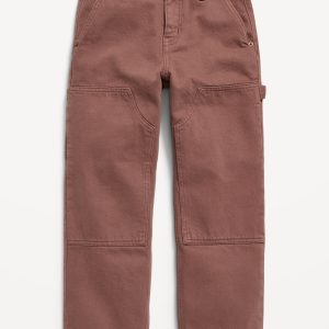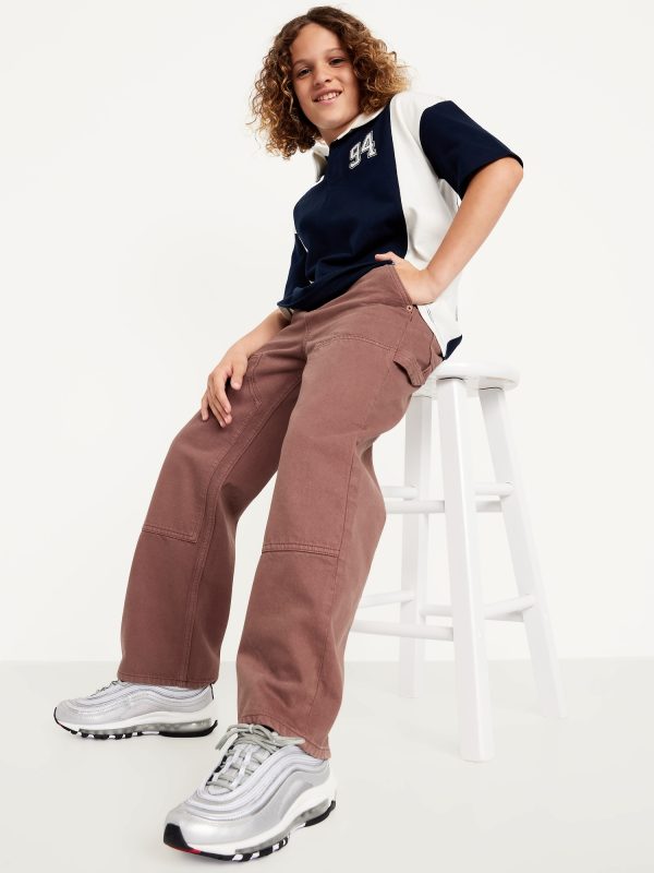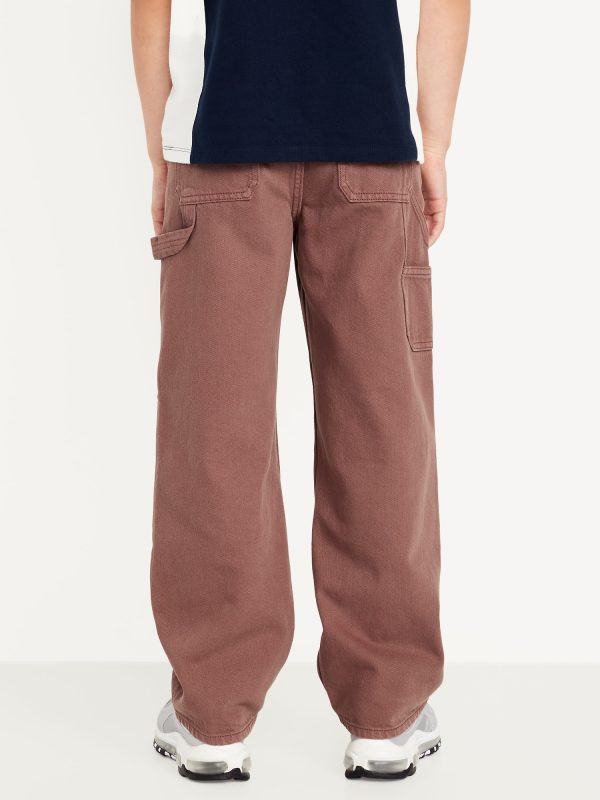 Baggy Carpenter Jeans for Boys: interior adjustable waistband, snap-button closure in sizes 5-8, regular button closure in sizes 10-20, zip fly, diagonal pockets, panel at each leg, utility patch pockets at back, built-in hammer loop at left leg, #766418
