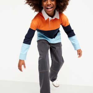 Baggy Carpenter Jeans for Boys: interior adjustable waistband, snap-button closure in sizes 5-8, regular button closure in sizes 10-20, zip fly, diagonal pockets, panel at each leg, utility patch pockets at back, built-in hammer loop at left leg, #766418