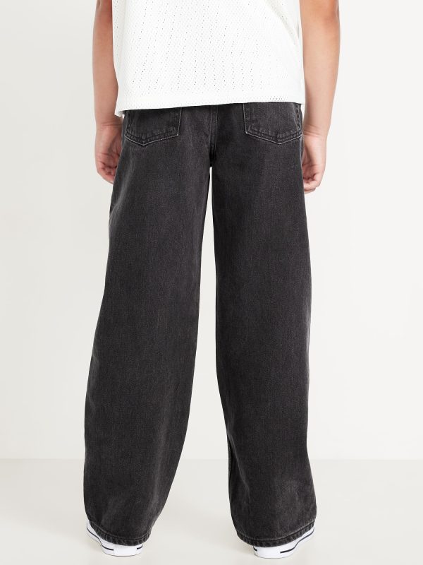 Baggy Non-Stretch Jeans for Boys: interior adjustable waistband, sizes 5-8 snap-button closure, regular button closure sizes 10-20, zip fly, diagonal pockets, utility patch pockets at back, built-in hammer loop at left leg, #805572