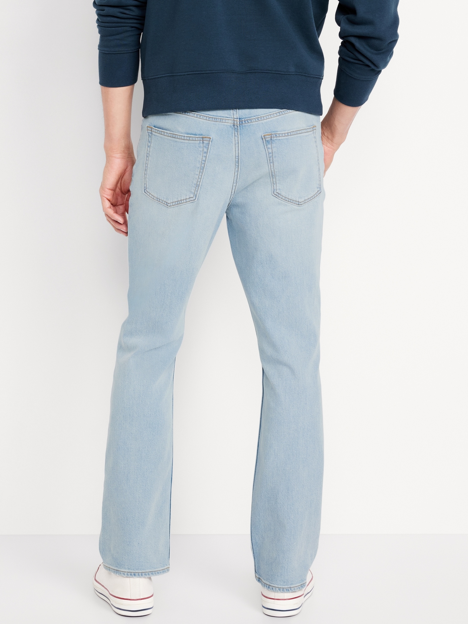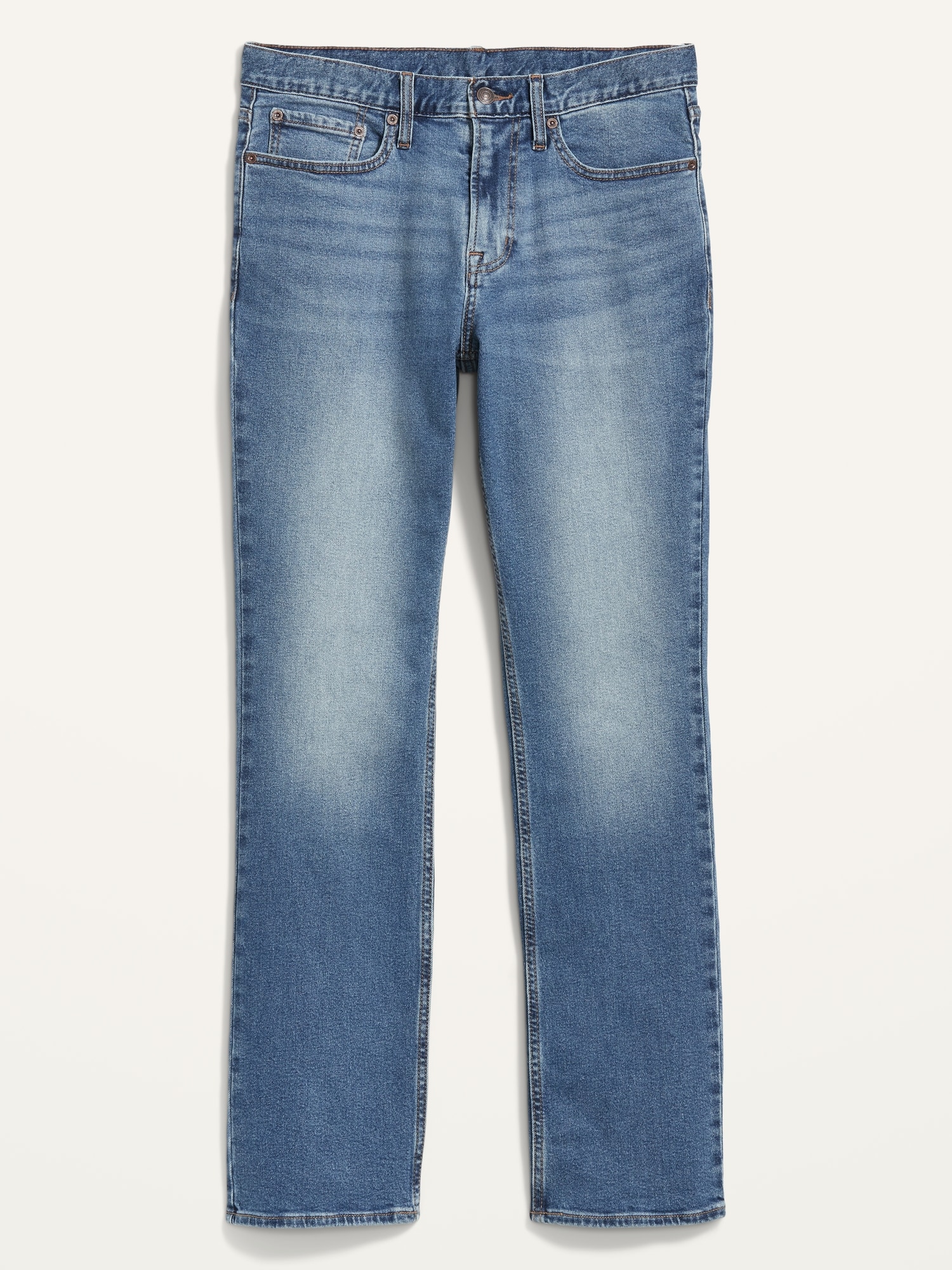 Boot-Cut Built-In Flex Jeans: Relaxed through the hip, wide below the knee.button front, whiskering and fading, zip fly, front scoop pockets, back patch pockets, #564925