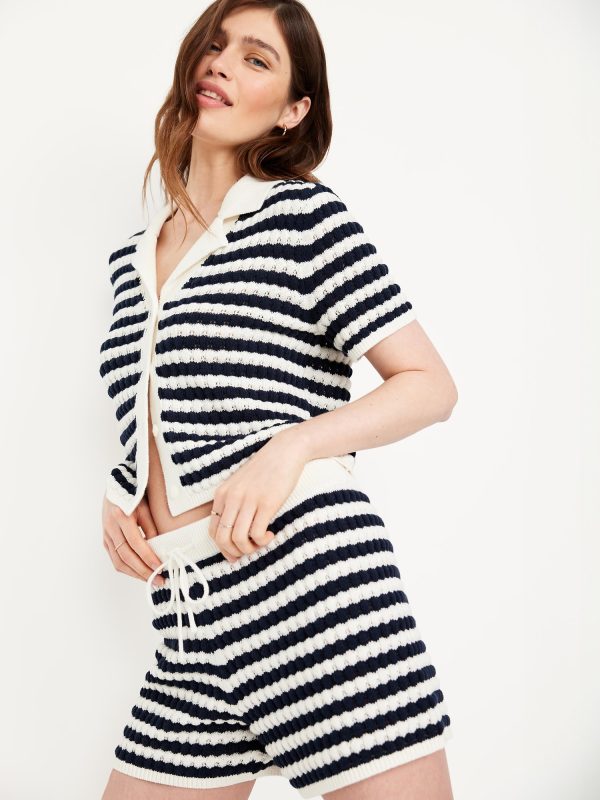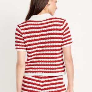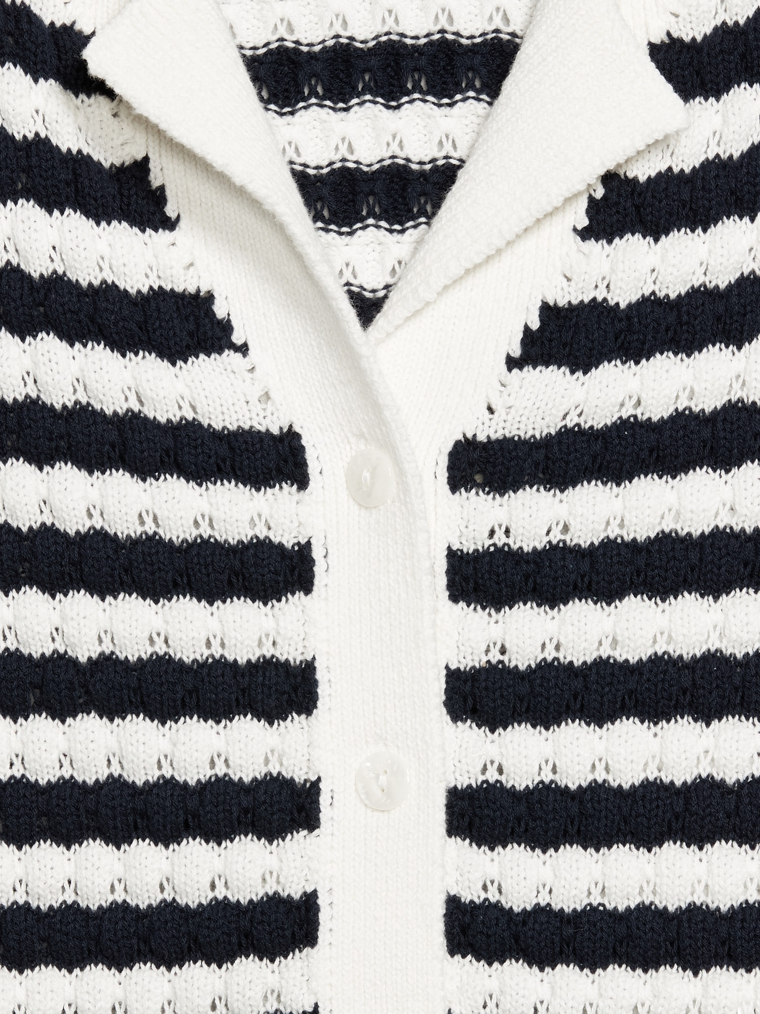 Button-Down Crochet Sweater: spread collar, short sleeves, full-button front, striped crochet, #761457