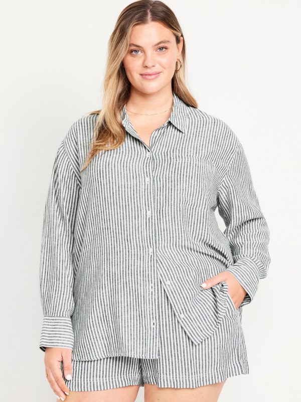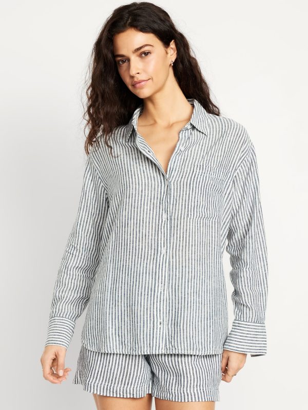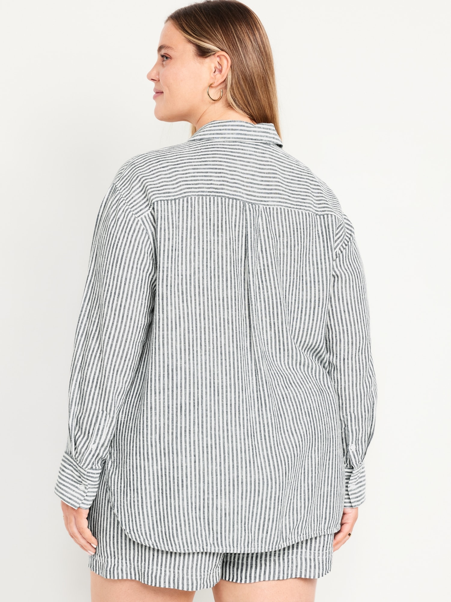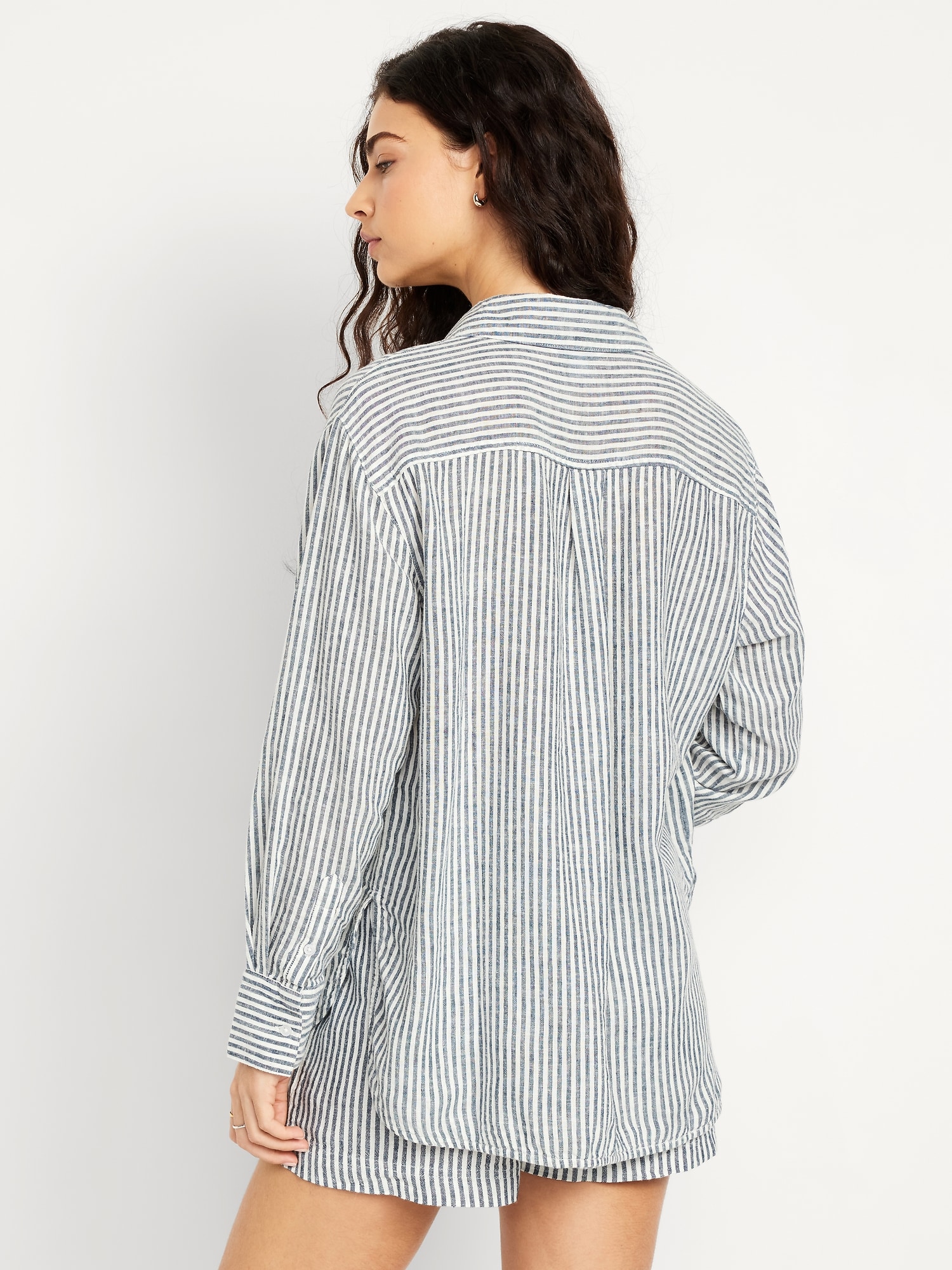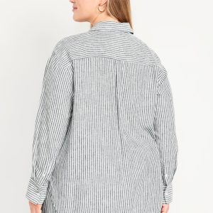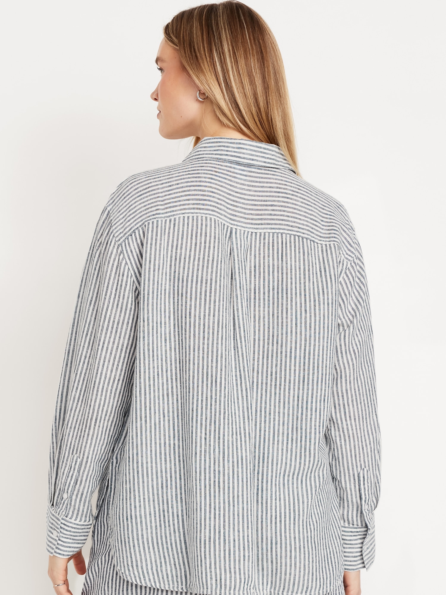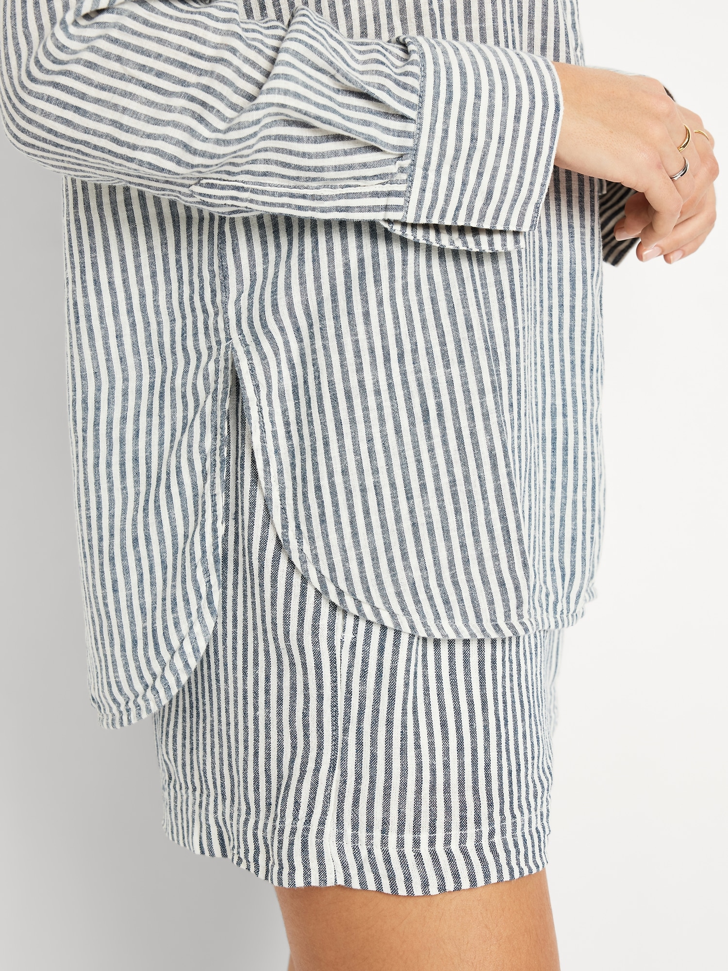 Button-Down Linen-Blend Striped Shirt: spread collar, long sleeves, buttoned cuffs, patch chest pocket, full-button front, striped print, curved hi-lo hem, #693623