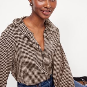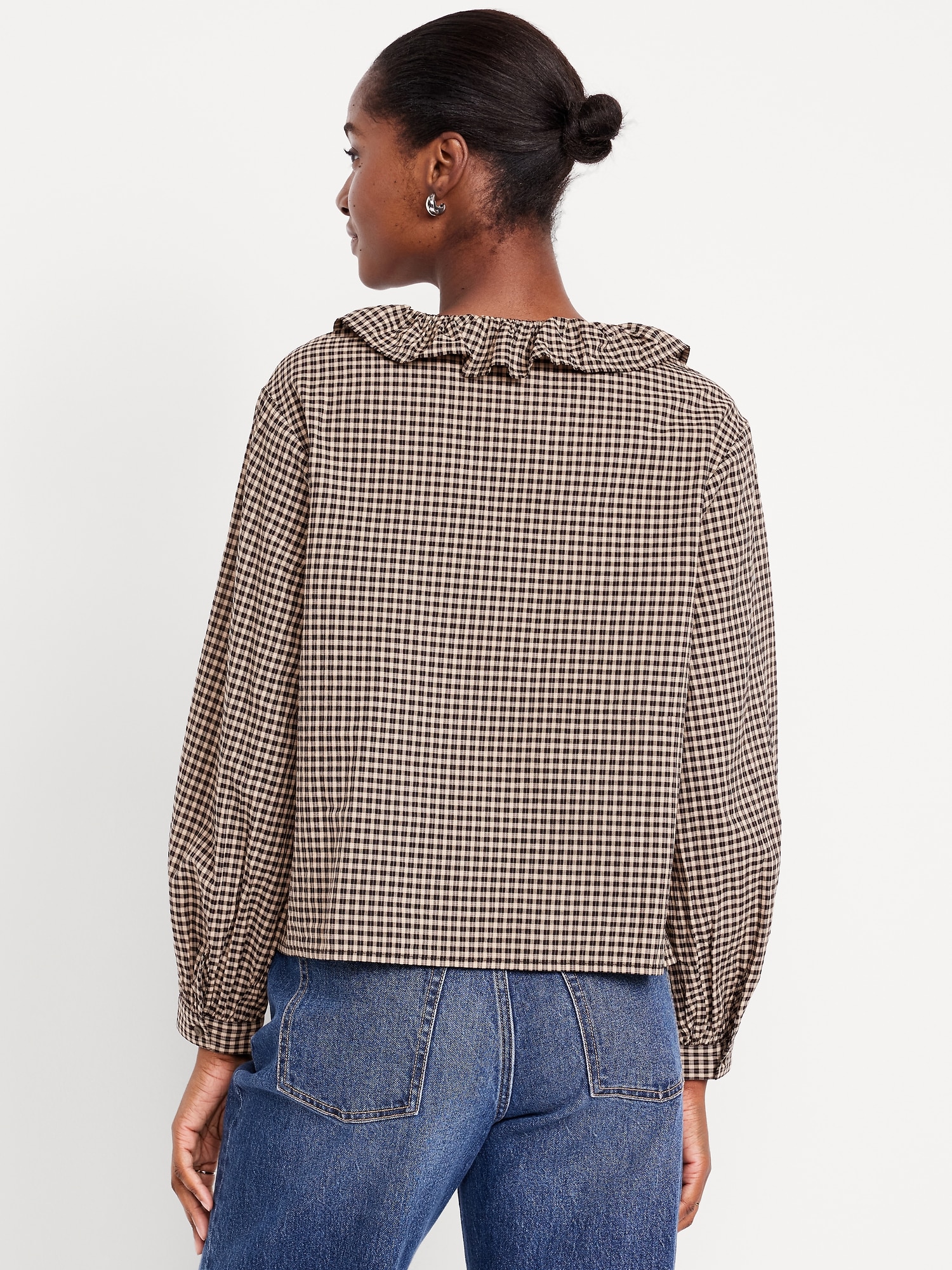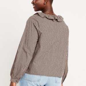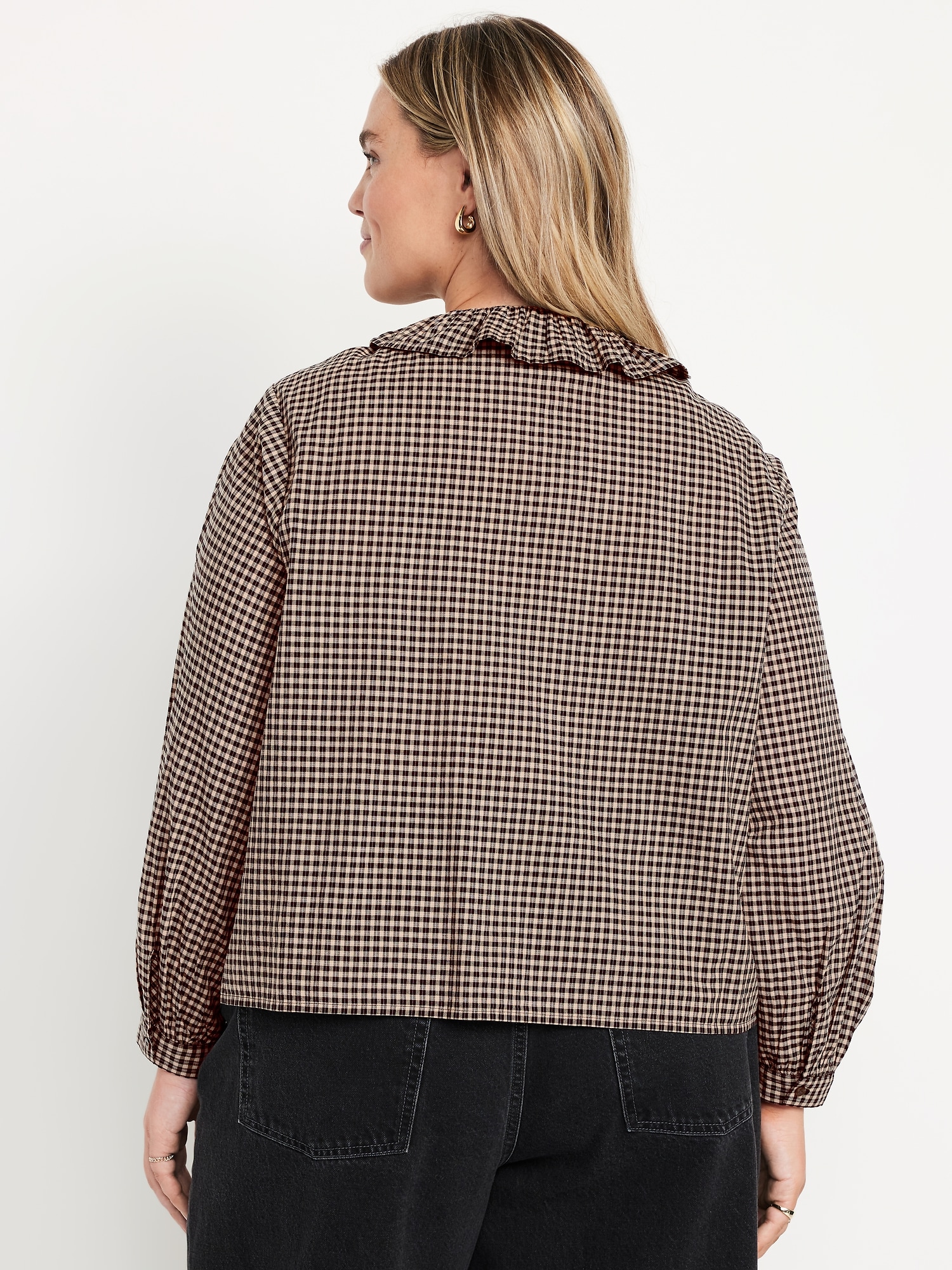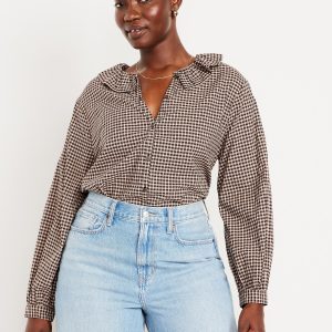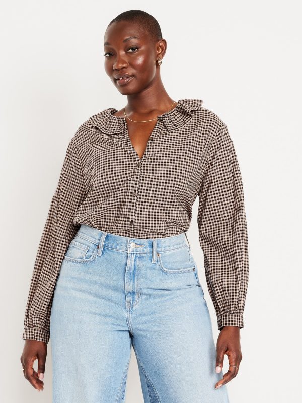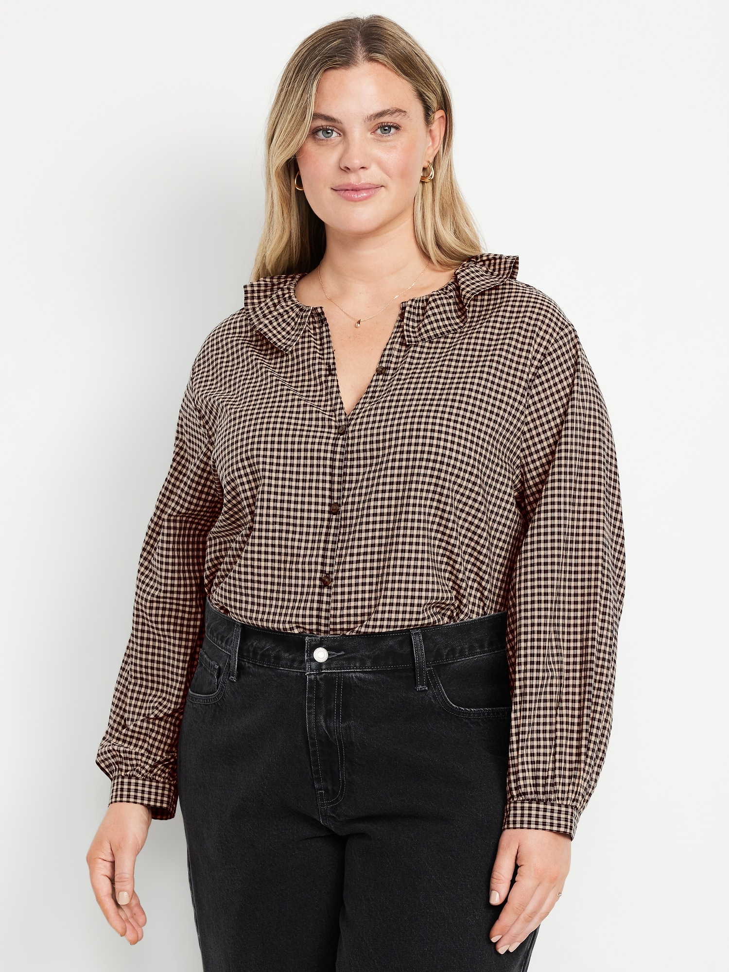 Button-Down Ruffle Shirt: ruffle collar, long sleeves, shirred-button cuffs, full-button front, plaid print, #805732