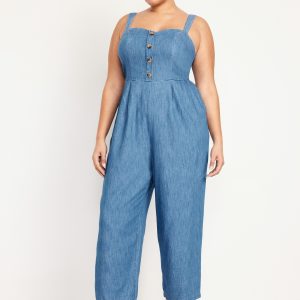 Button-Front Cami Jumpsuit: sweetheart neckline, wide adjustable straps, four-button front, hip pockets, smocked back, #681202