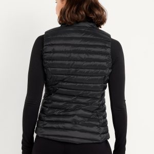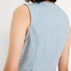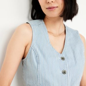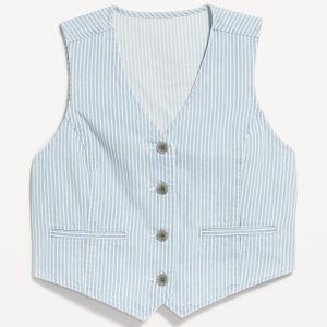 Button-Front Jean Vest: v-neck, four-button front, decorative welt pockets, princess seams, #693819
