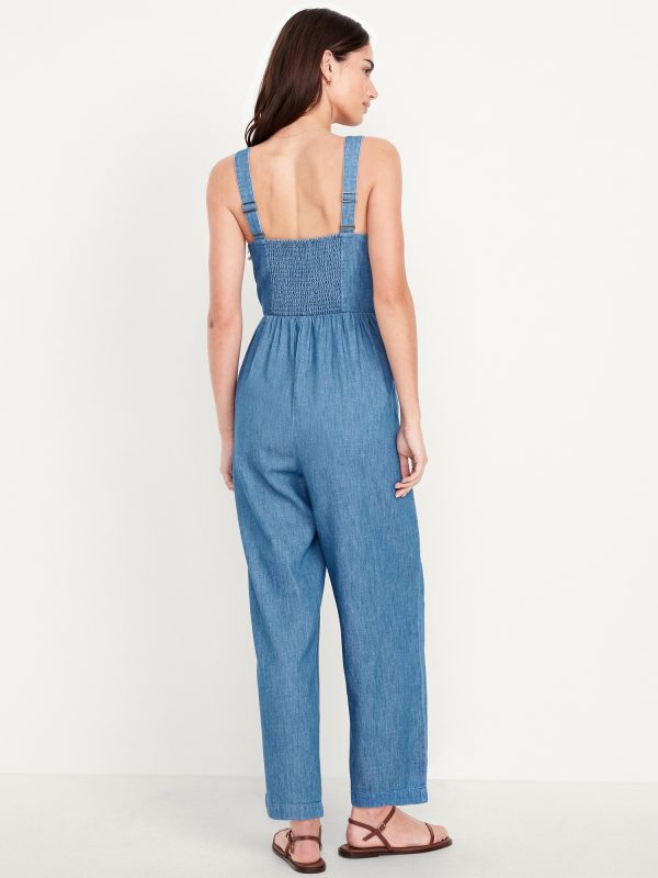 Button-Front Linen-Blend Cami Jumpsuit: sweetheart neckline, wide adjustable straps, four-button front, hip pockets, smocked back, #681202