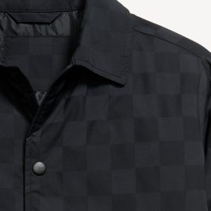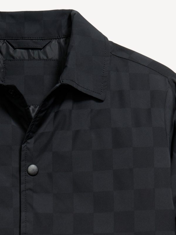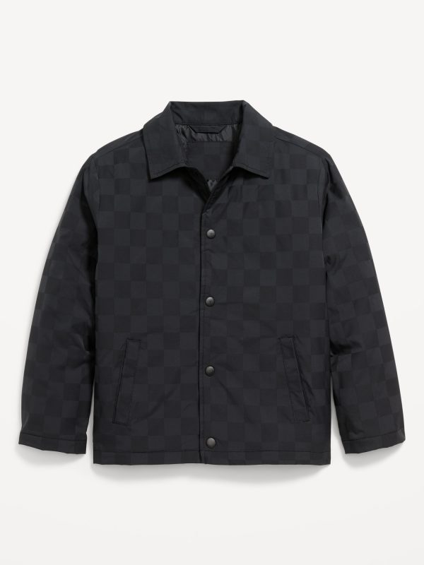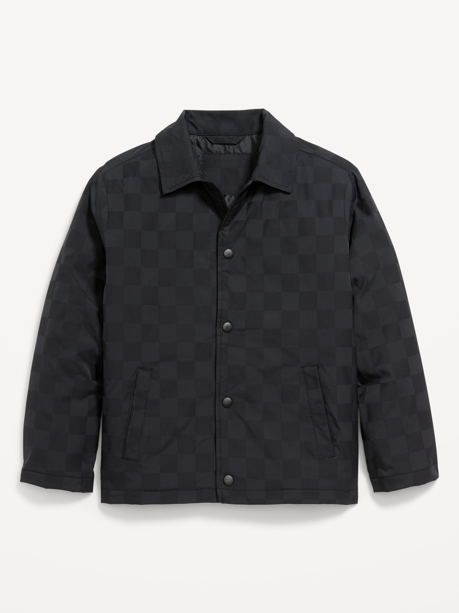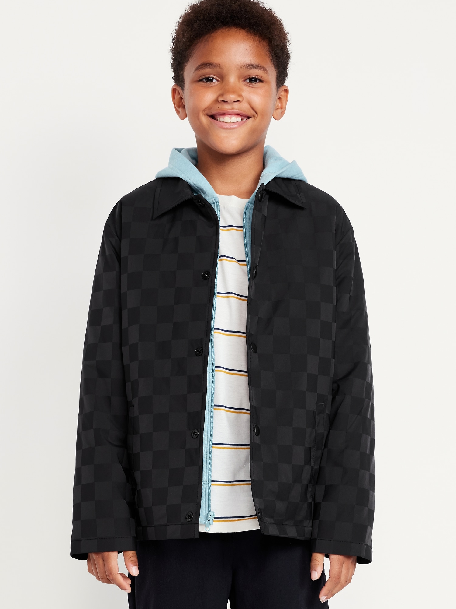 Button-Front Soccer Jacket for Boys: pointed spread collar, long sleeves, diagonal welt pockets, full length snap-button placket, all-over checkered pattern, #800736