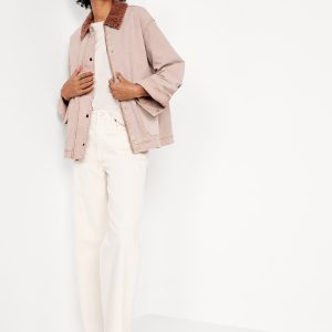 Canvas Barn Jacket: corduroy collar, long sleeves with snap cuffs, full-snap front with hidden zipper, patch pockets, #766357