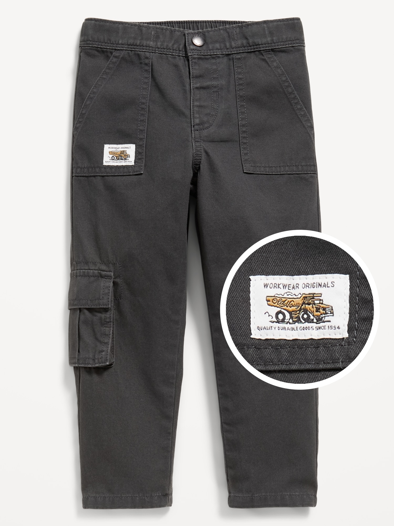 Cargo Twill Utility Pants for Toddler Boys: snap-button closure, faux fly, diagonal on-seam utility pockets, adhesive secure close cargo pockets, embroidered graphic patch at pocket, single patch pocket at back, #802124