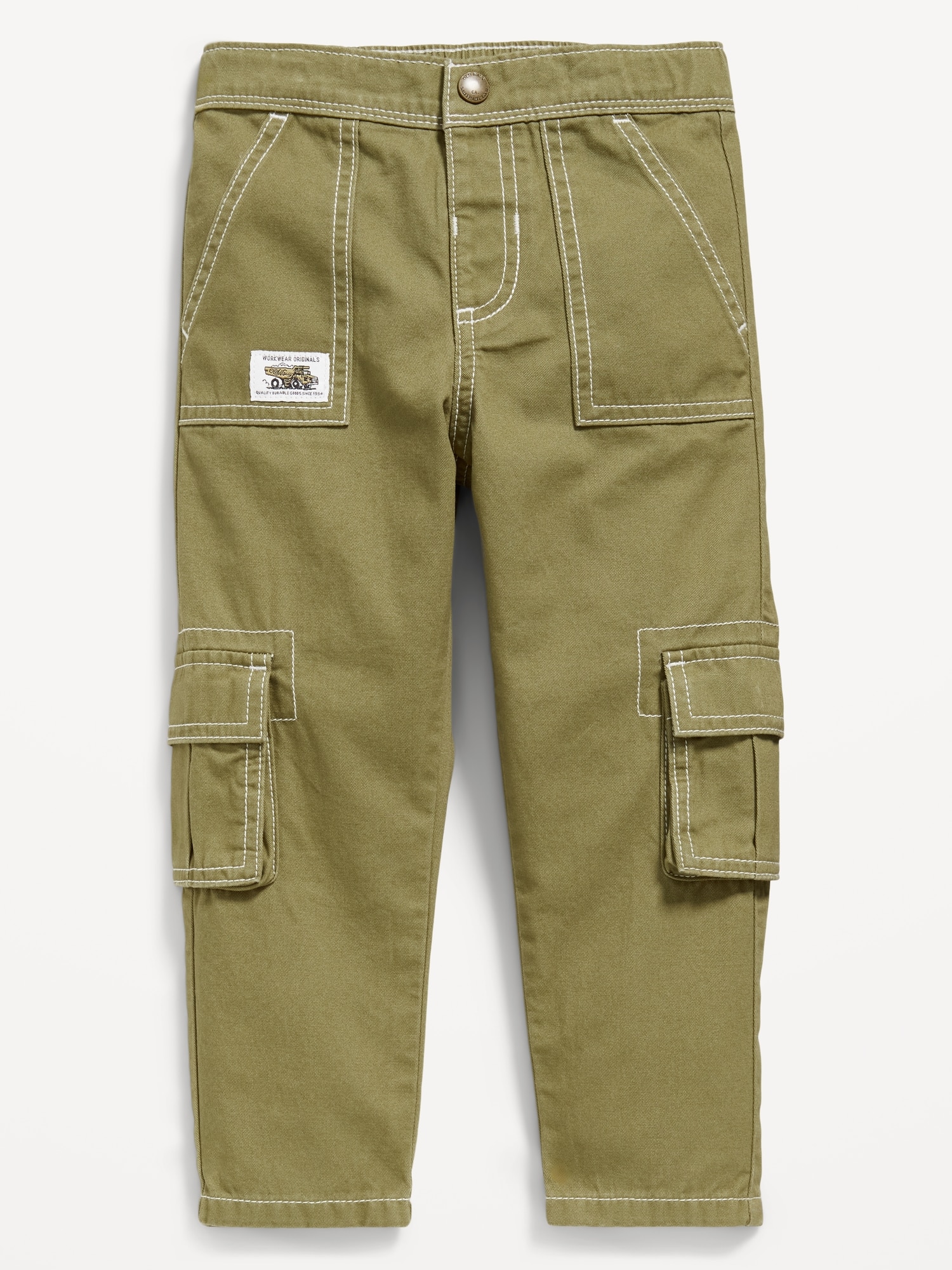 Cargo Twill Utility Pants for Toddler Boys: snap-button closure, faux fly, diagonal on-seam utility pockets, adhesive secure close cargo pockets, embroidered graphic patch at pocket, single patch pocket at back, #802124