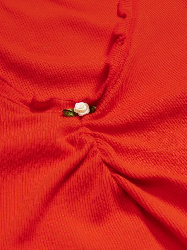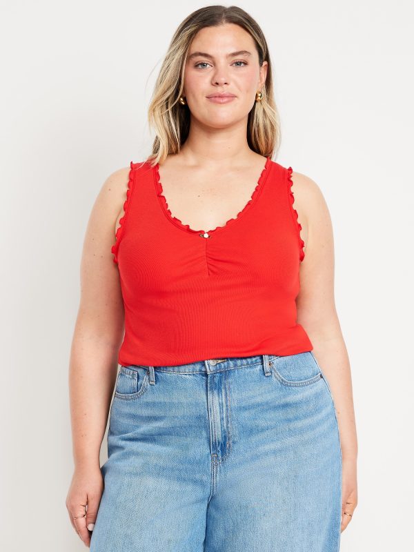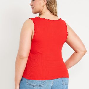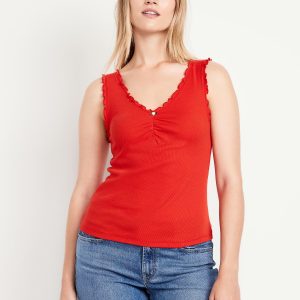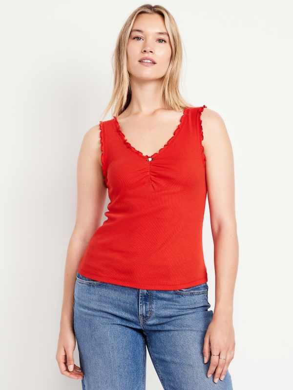 Cinched Rib-Knit Tank Top: deep v-neck, wide ruffled straps, cinched front with rosette applique, #791559