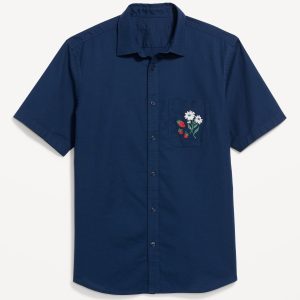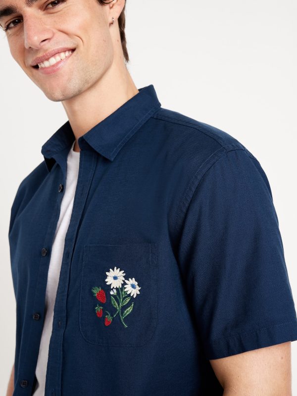 Classic Fit Everyday Linen-Blend Shirt: spread collar, short sleeves, full-button front, patch chest pocket, prints vary, #807396