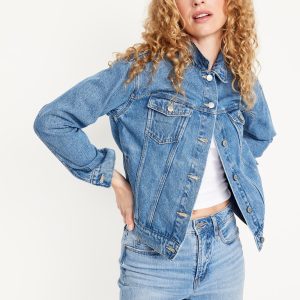 Classic Jean Jacket: spread collar, long sleeves, buttoned cuffs, flap-button chest pockets, on-seam front pockets, full-button front, banded hem, adjustable button tabs at back waist, #467752