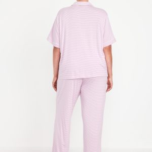 Classic Jersey Pajama Pant Set: set includes pajama shirt and matching bottoms, notched collar, short sleeves, button front, elastic-waist pajama pants with piping at hem, striped print, #808325
