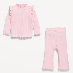 Cozy Long-Sleeve Ribbed Ruffle-Trim Top and Pants Set for Baby