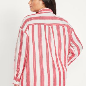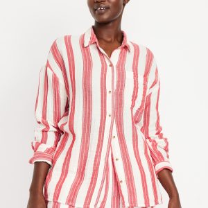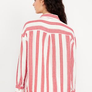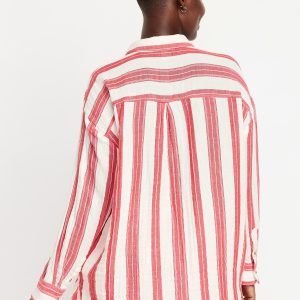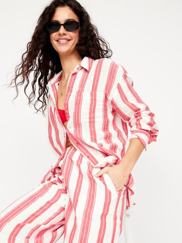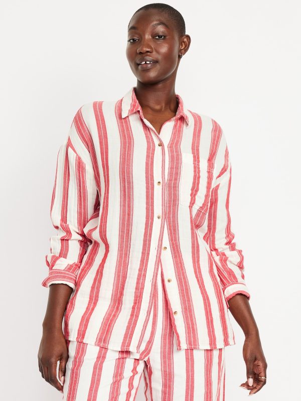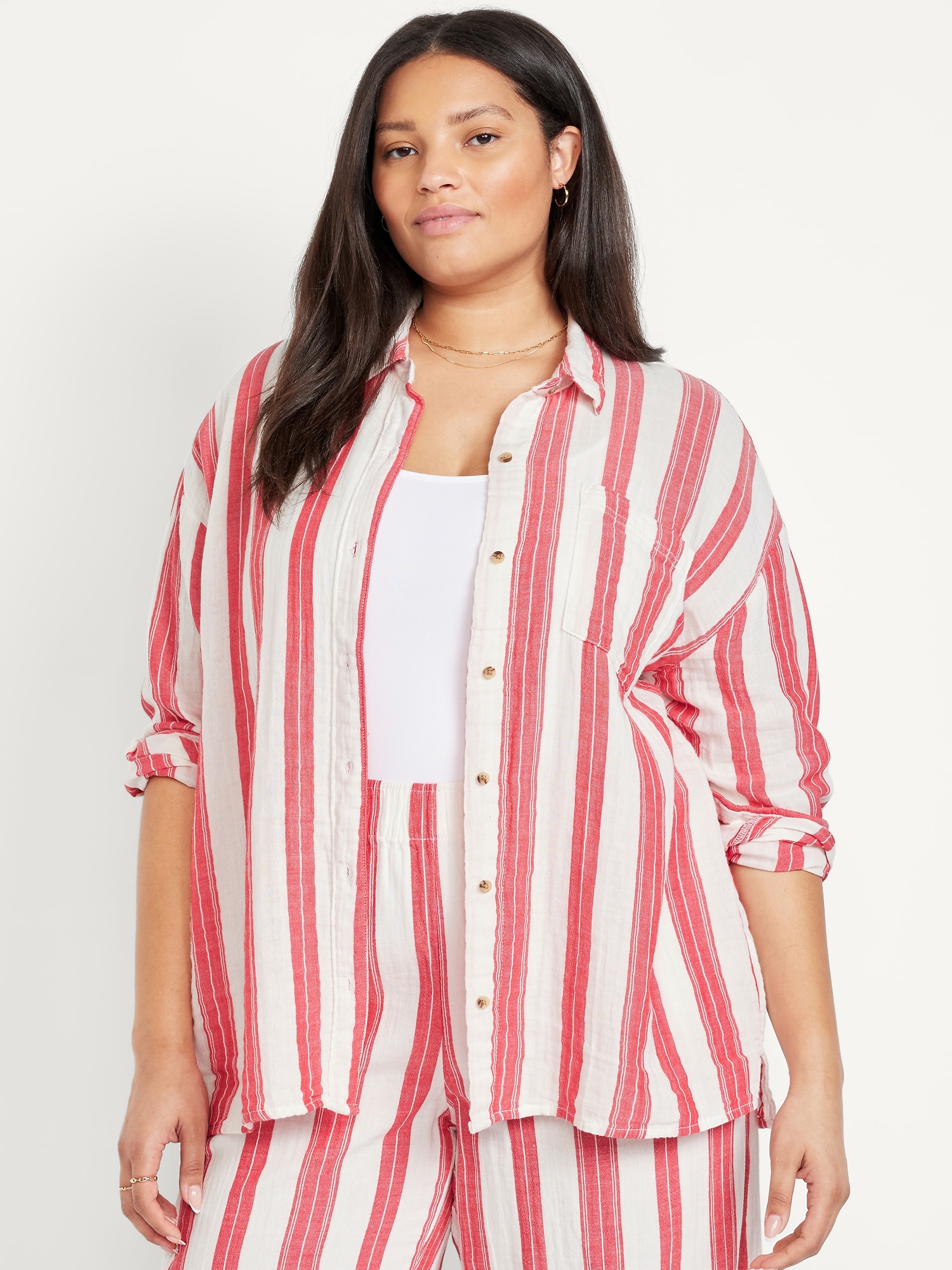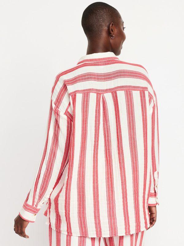 Crinkle Gauze Button-Down Shirt: A light, rippled fabric that’s begging to be beachside.spread collar, long sleeves, full-button front, patch chest pocket, vertical striped print, #704105