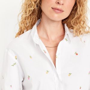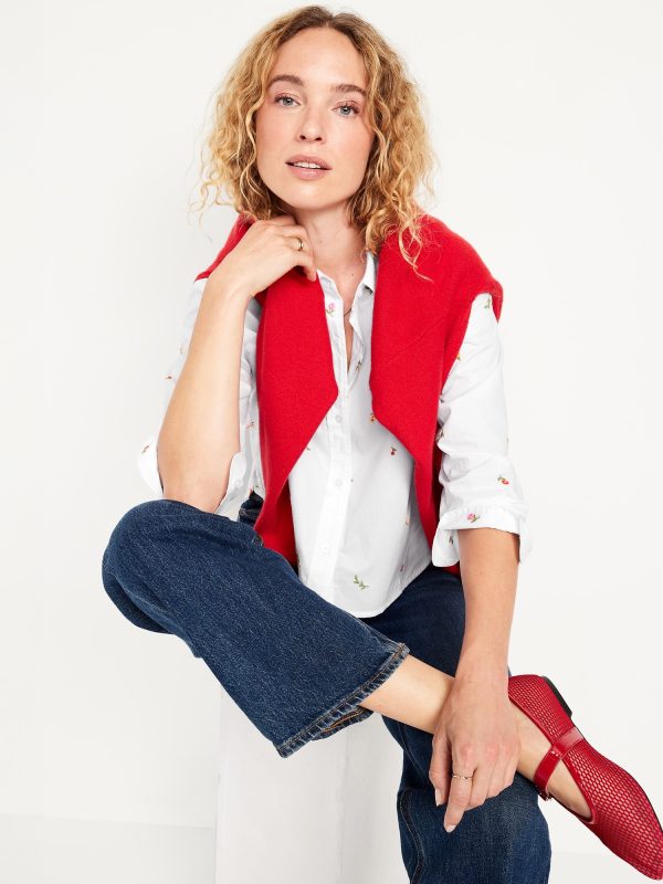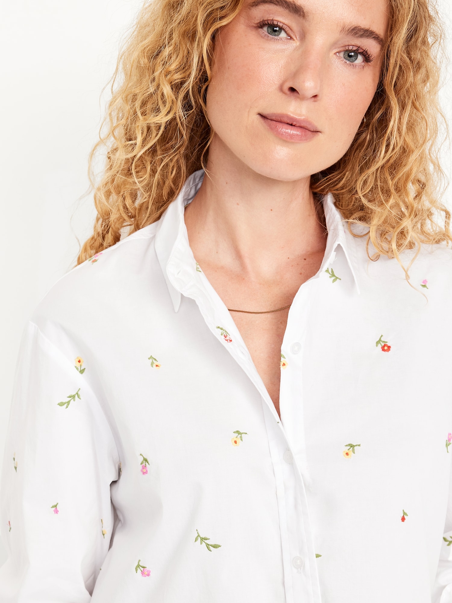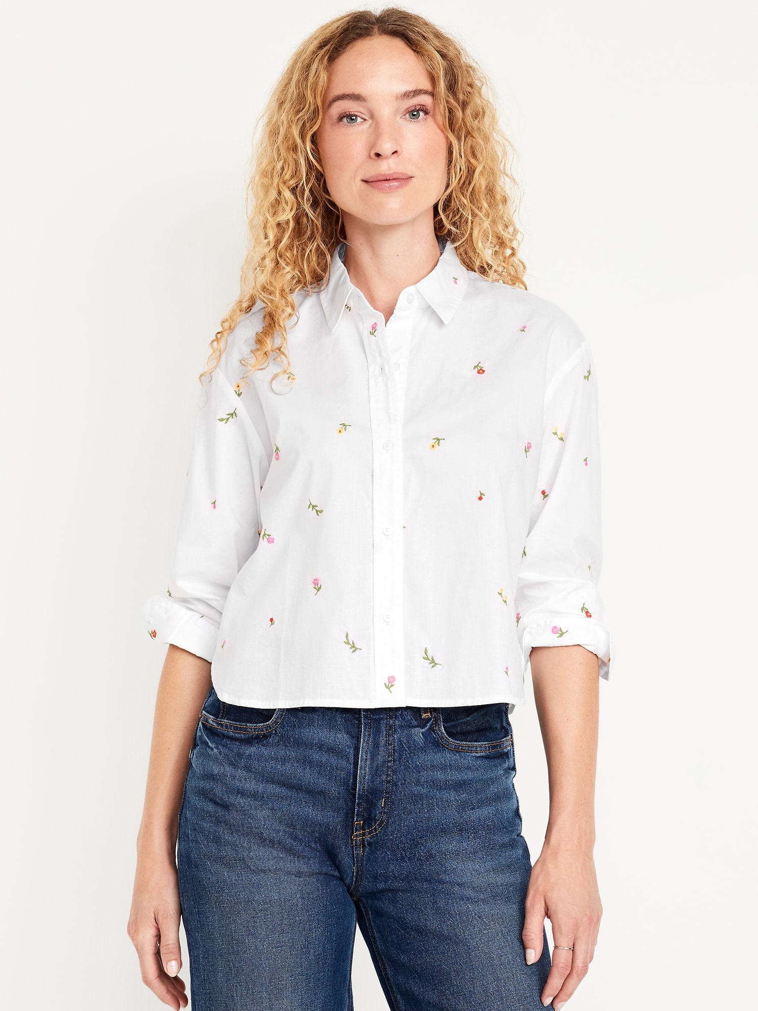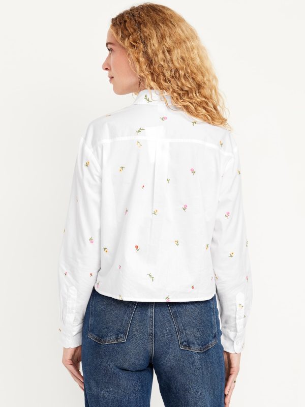 Cropped Button-Down Shirt: spread collar, long sleeves with buttoned cuffs, full-button front, patch chest pocket, vertical striped print, #825106