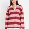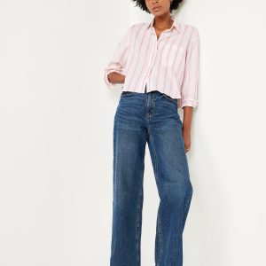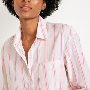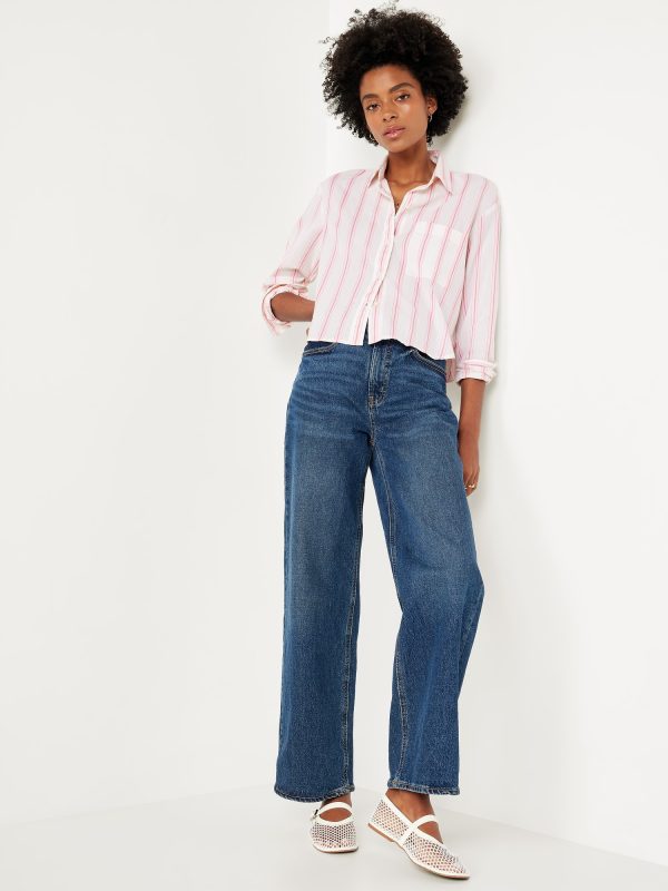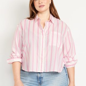Cropped Button-Down Striped Shirt: spread collar, long sleeves with buttoned cuffs, full-button front, patch chest pocket, vertical striped print, #825106
