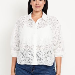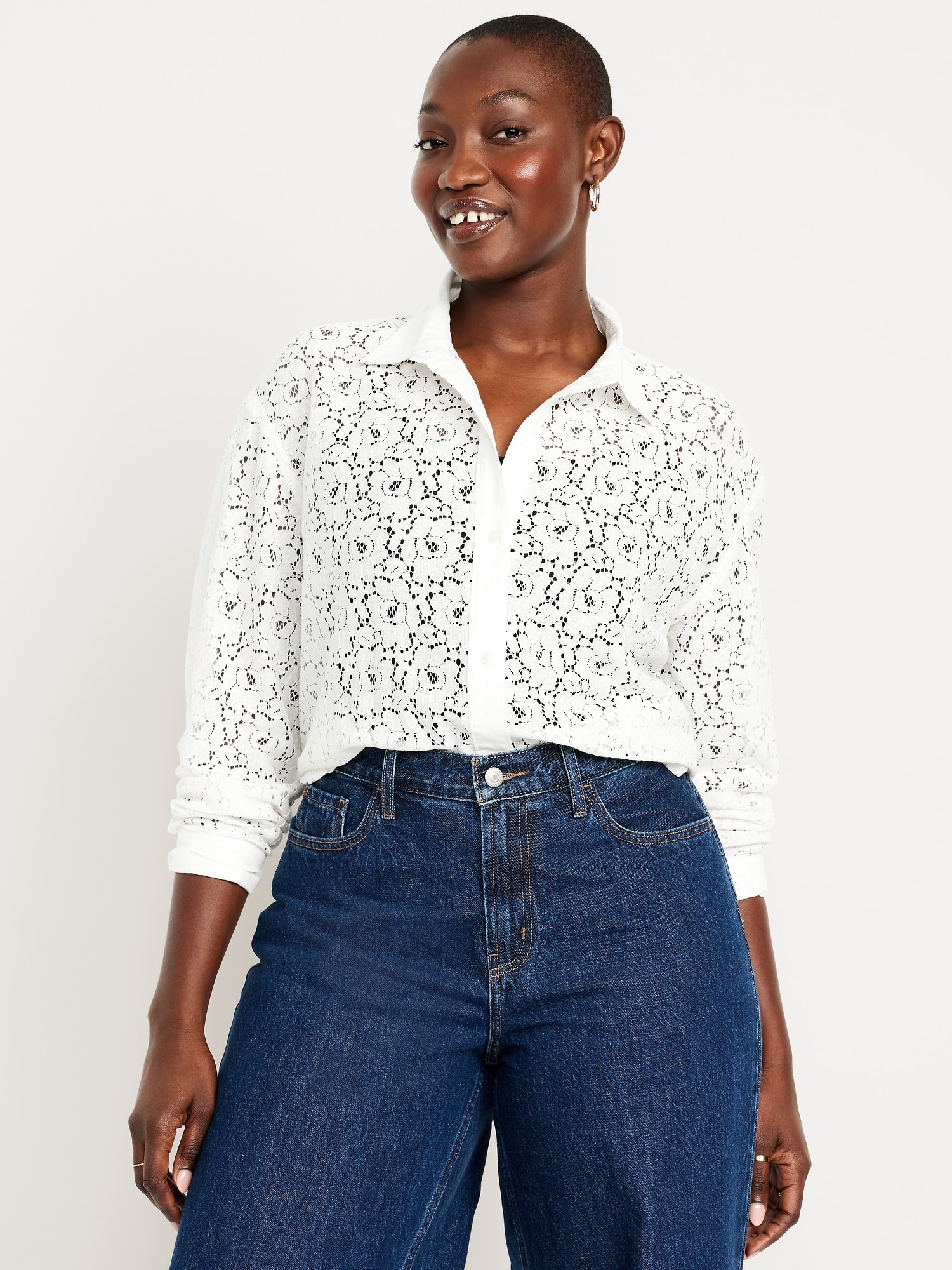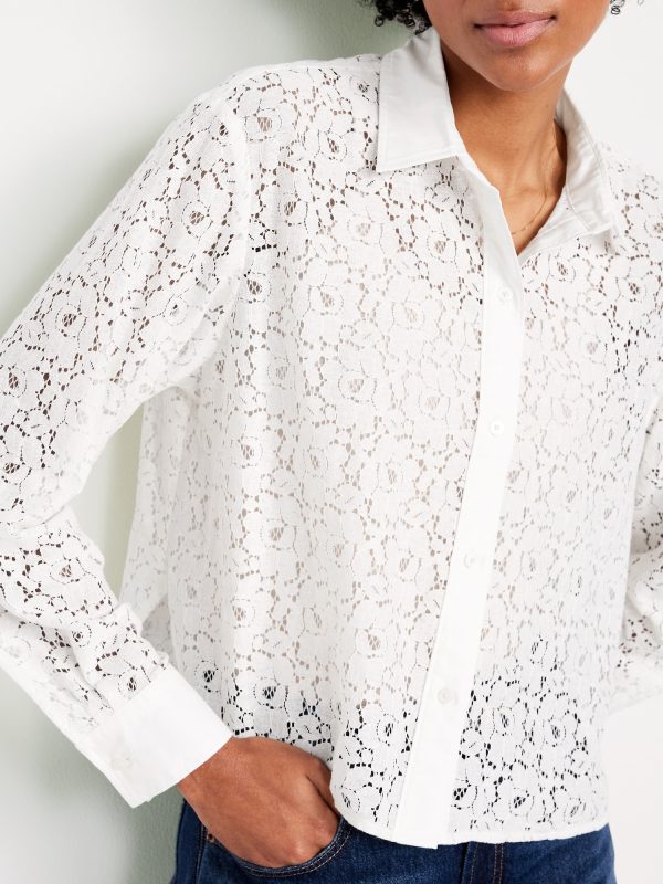 Cropped Lace Button-Down Shirt: spread collar, long sleeves with buttoned cuffs, full-button front, patch chest pocket, vertical striped print, #825106