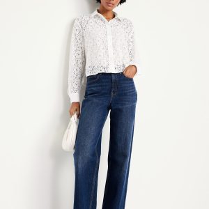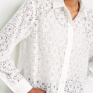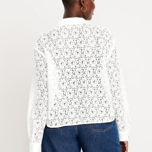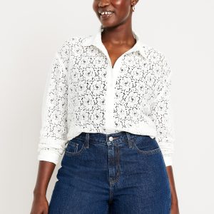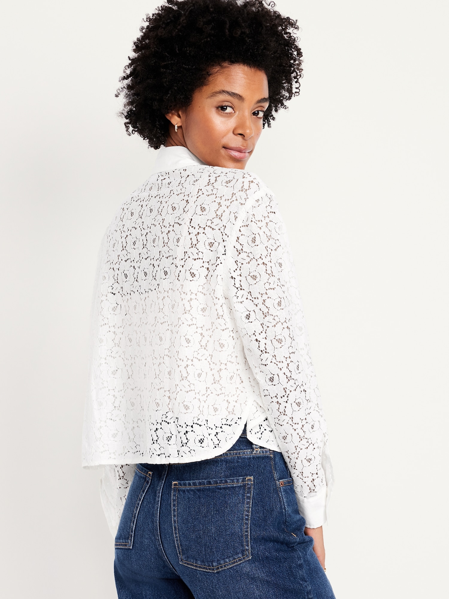 Cropped Lace Button-Down Shirt: spread collar, long sleeves with buttoned cuffs, full-button front, patch chest pocket, vertical striped print, #825106
