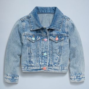 Cropped Trucker Jean Jacket for Toddler Girls: pointed collar, long sleeves, multi-color snap-button placket, faux snap-flap pockets at chest, on-seam welt pockets, #693444