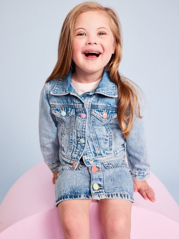 Cropped Trucker Jean Jacket for Toddler Girls: pointed collar, long sleeves, multi-color snap-button placket, faux snap-flap pockets at chest, on-seam welt pockets, #693444