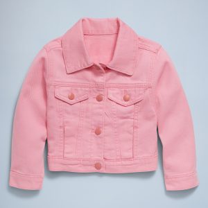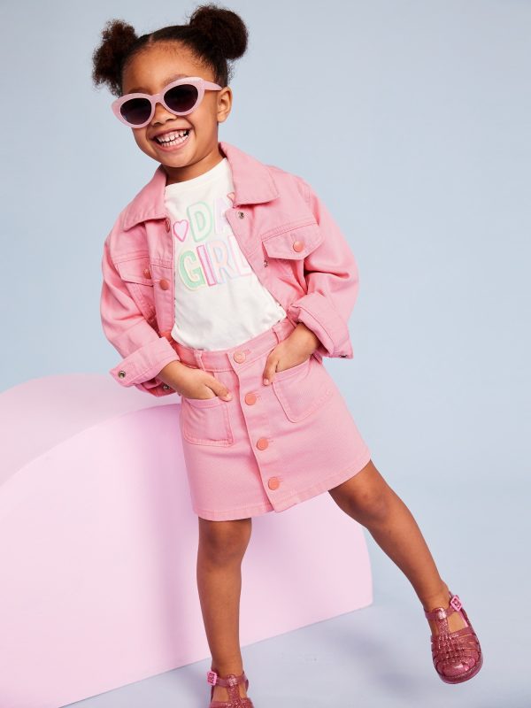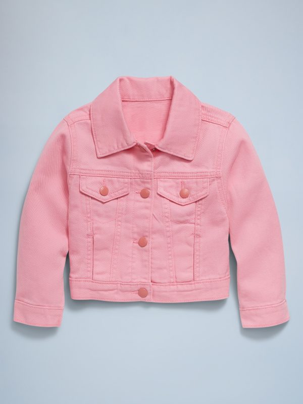 Cropped Trucker Twill Jacket for Toddler Girls: pointed collar, long sleeves, multi-color snap-button placket, faux snap-flap pockets at chest, on-seam welt pockets, #693444