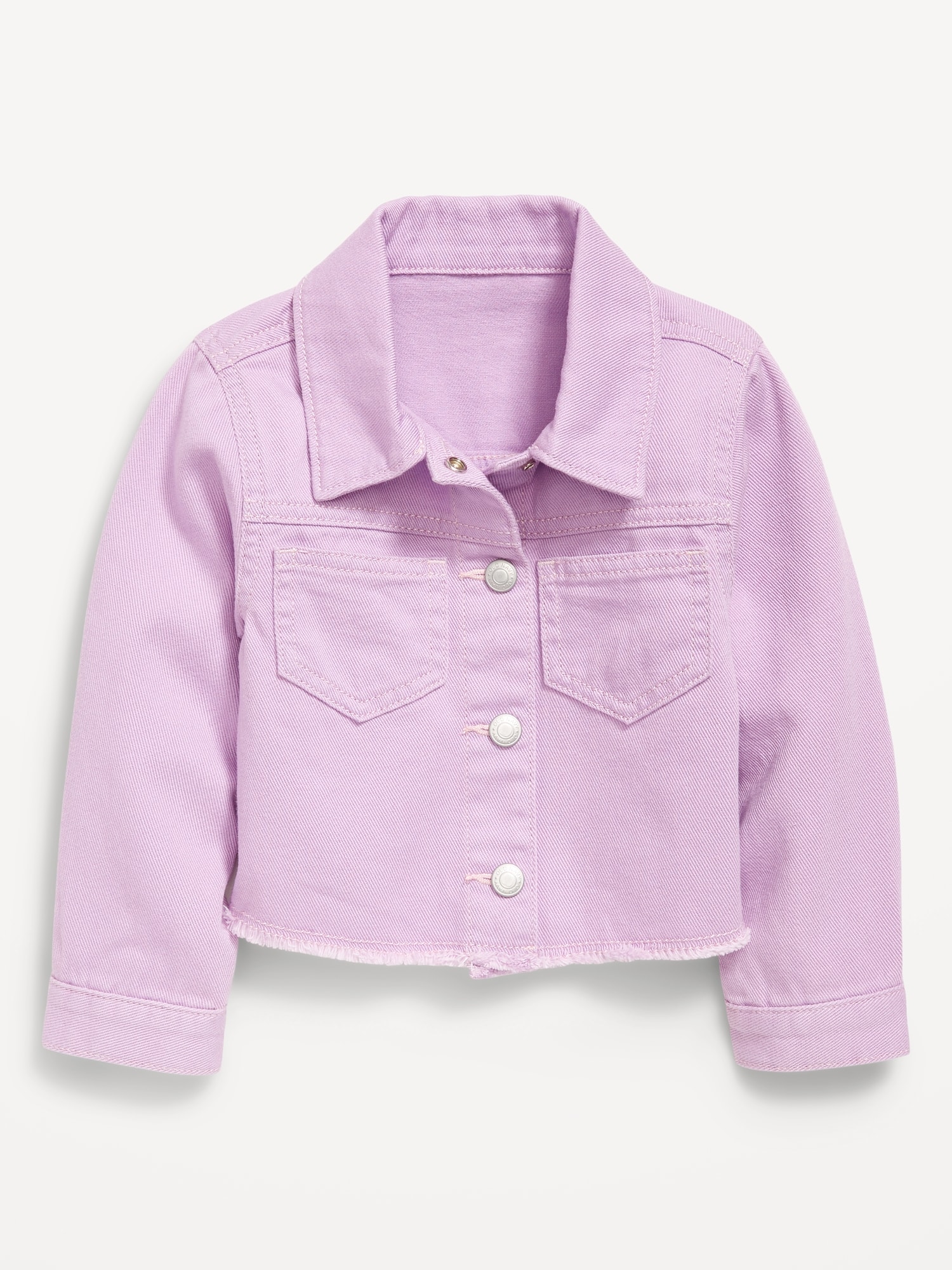 Cropped Twill Flower-Back Jacket for Toddler Girls: pointed collar, long sleeves, patch pockets at chest, large-scale flower at back, full length snap-buttoned placket, cutoff raw hem, #762350
