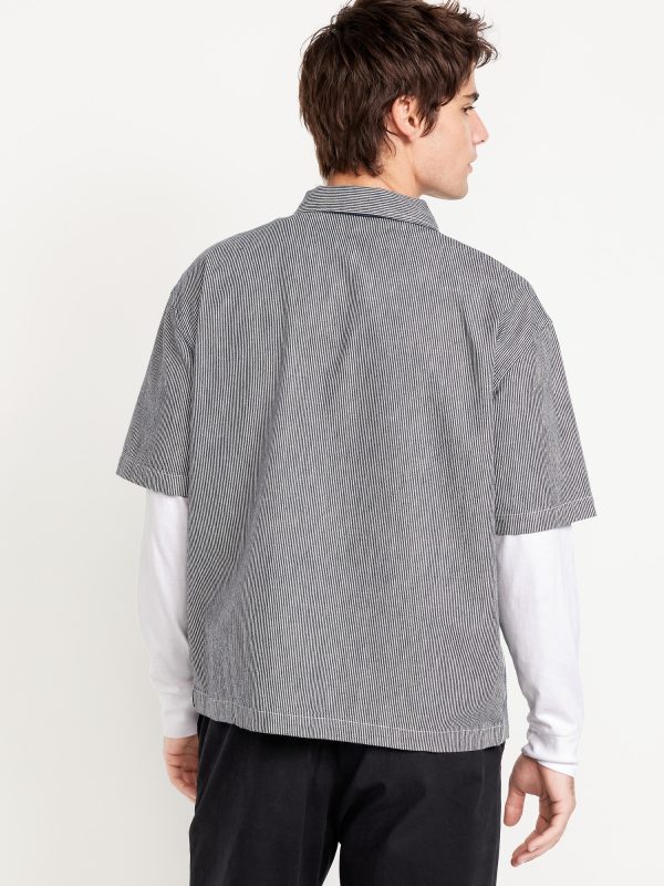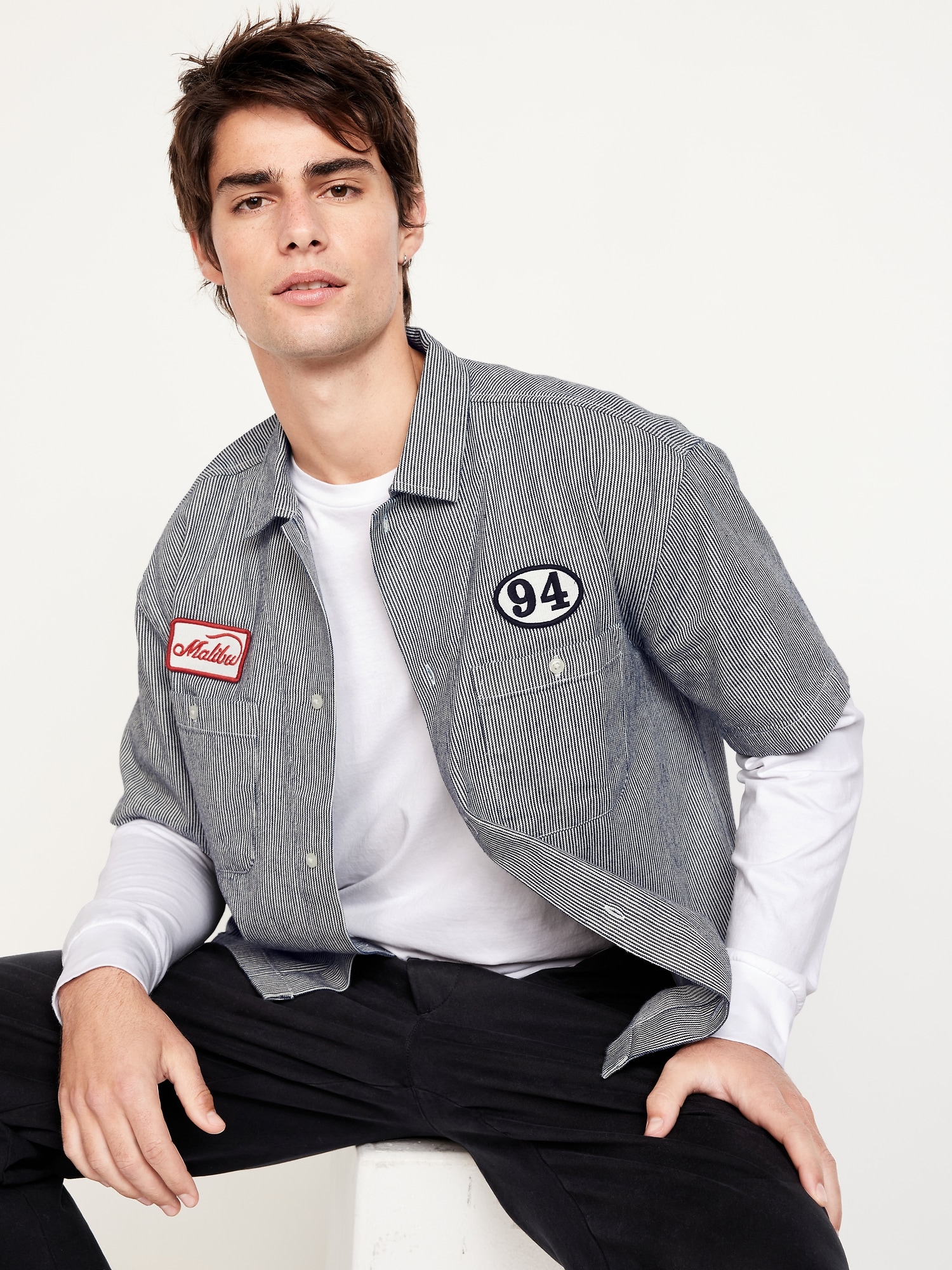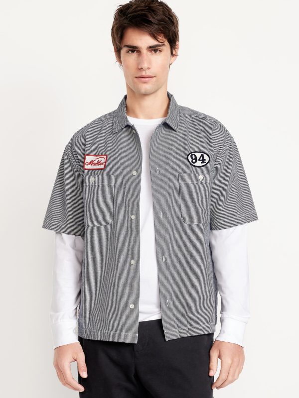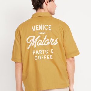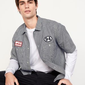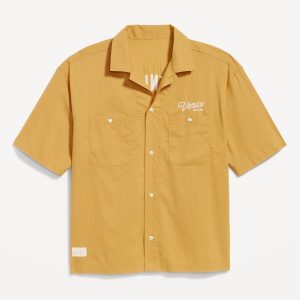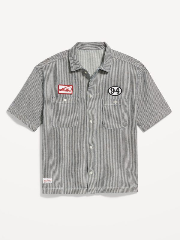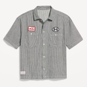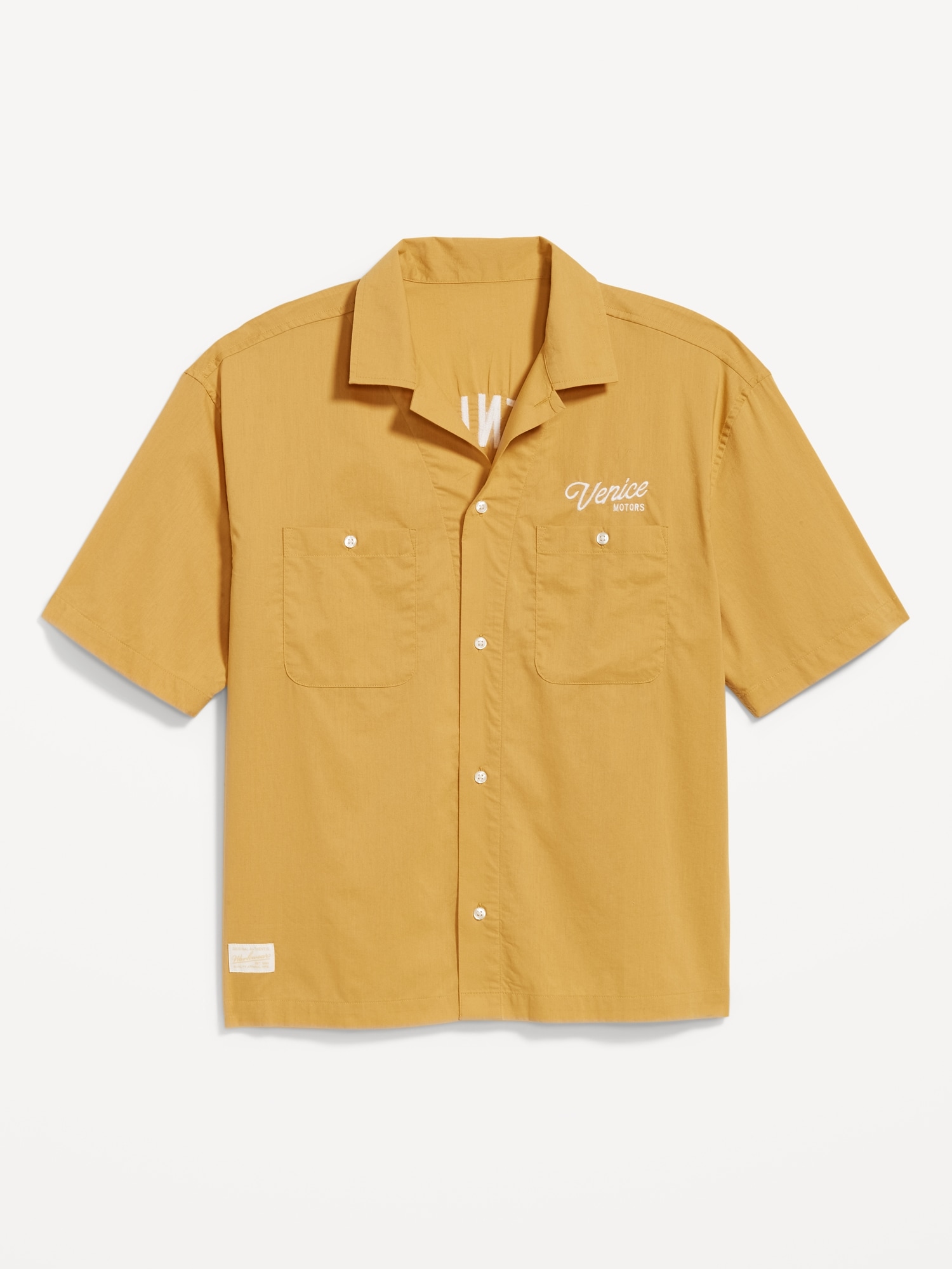 Cropped Utility Dobby Shirt: notched collar, short sleeves, embroidered chest graphic varies, button-patch chest pockets, full-button front, #762369