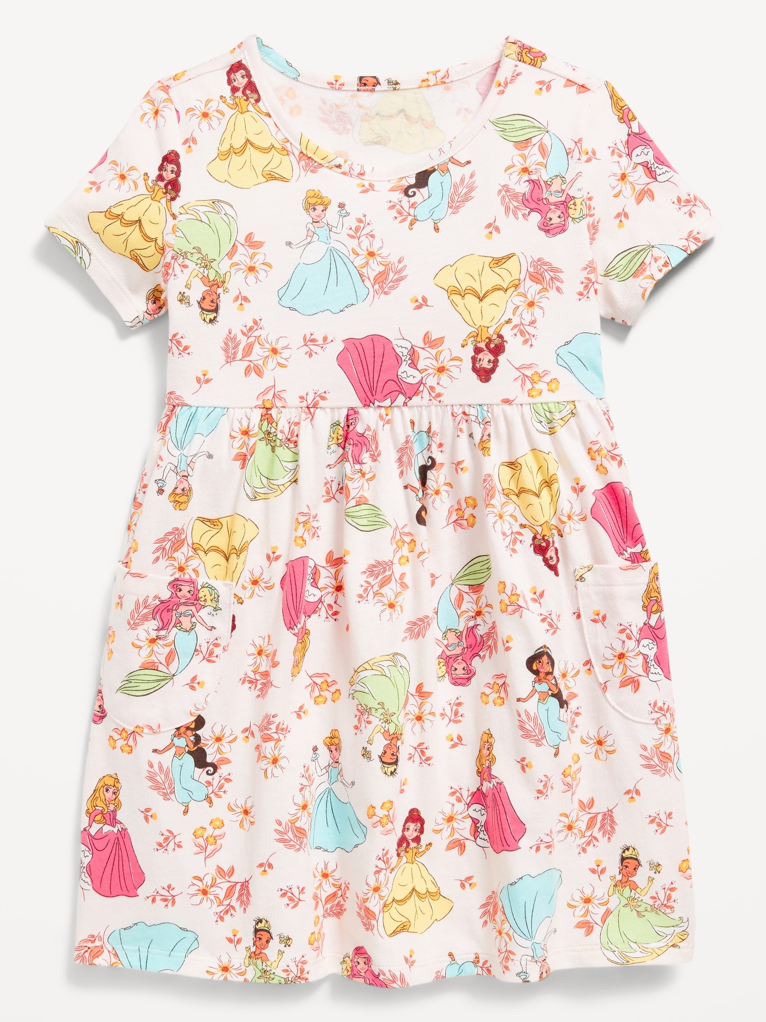 Disney© Fit and Flare Pocket Dress for Toddler Girls: scoop neck, short sleeves, seamed waist, full skirt, patch pockets at skirt, all-over licensed graphic, ©Disney., online exclusive, #803674