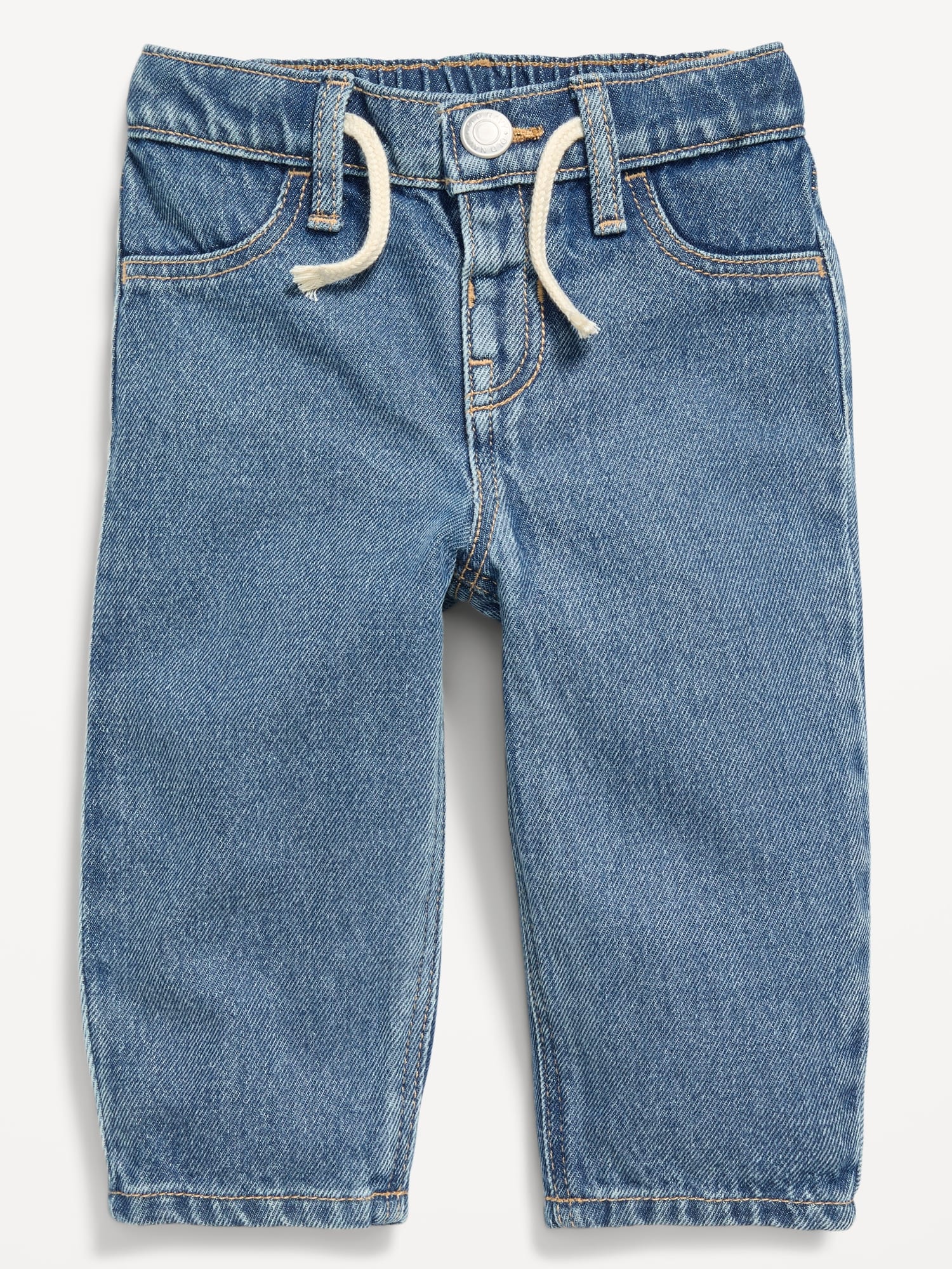 Drawstring Barrel-Leg Jeans for Baby: elasticized waistband, snap-button closure, nonfunctional drawstring, faux fly, decorative scoop pockets, patch pockets at back, barrel leg, #806247