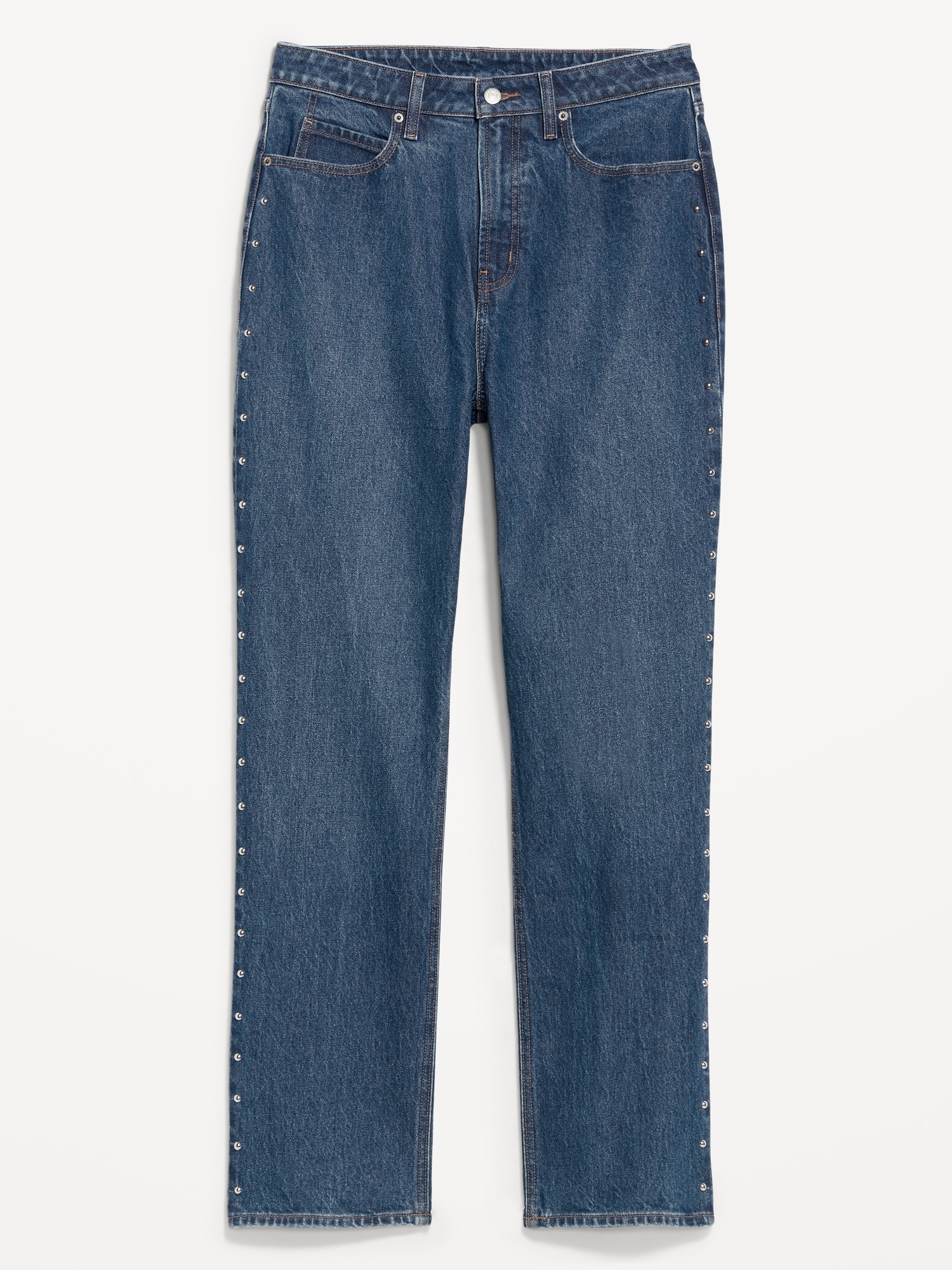 Extra High-Waisted Studded Straight Jeans: Snatched waist with a streamlined leg and a classic silhouette.extra high waist, zip fly, straight leg, #805695