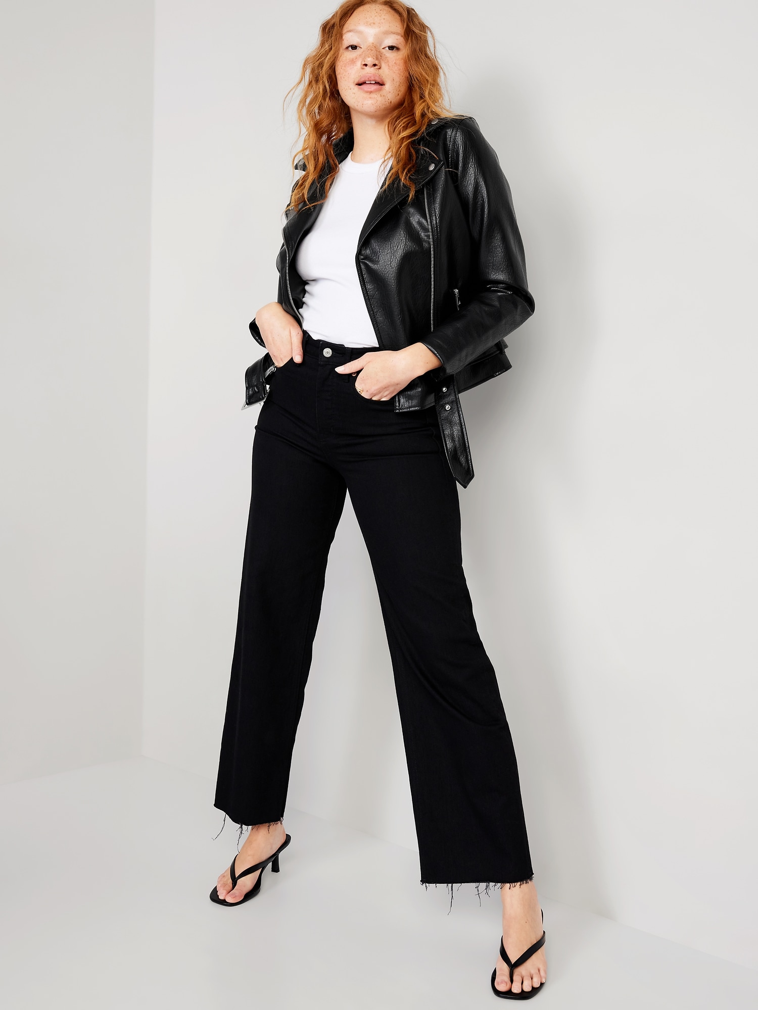 Faux-Leather Belted Biker Jacket: notched lapel, snap buttons, long sleeves, full-zip front, zip welt pockets, belted hem, #752075