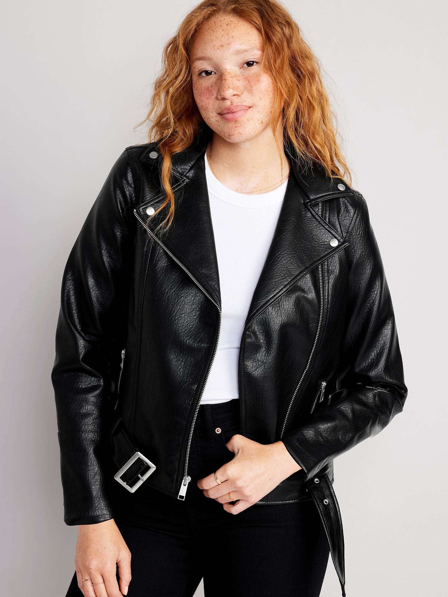 Faux-Leather Belted Biker Jacket