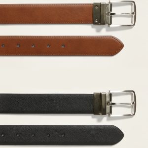 Faux-Leather Reversible Belt: reversible faux-leather belt is dark brown on one side, black on the other, metal buckle, #767722