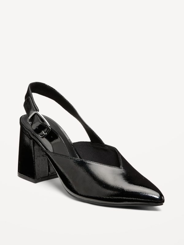 Faux-Leather Slingback Heels for Women: pointed toe, wide buckled ankle strap, block heel, #788065