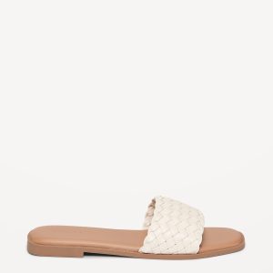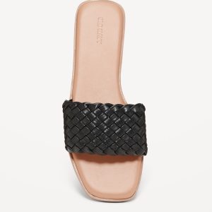 Faux-Leather Woven Slide Sandals: single strap upper, square toe, cushioned foot bed, slide-on style, #684808