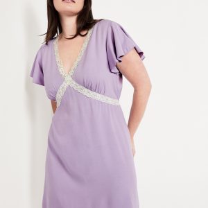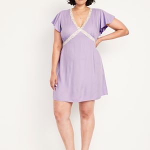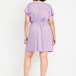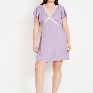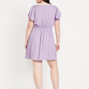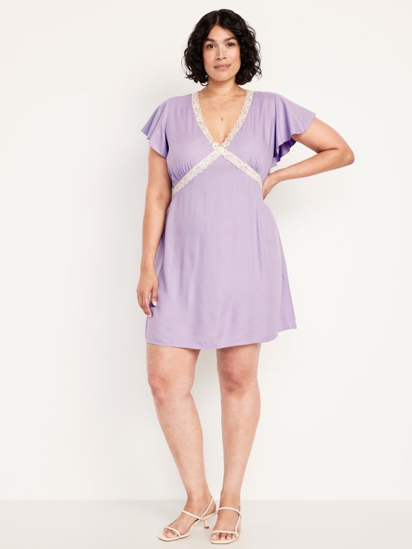 Fit & Flare Crepe Lace-Trim Mini Dress: lace-trim v-neck and bodice, short flutter sleeves, elasticized back waist, prints vary by color, #798245