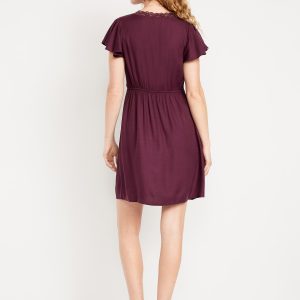 Fit & Flare Crepe Lace-Trim Mini Dress: lace-trim v-neck and bodice, short flutter sleeves, elasticized back waist, prints vary by color, #798245
