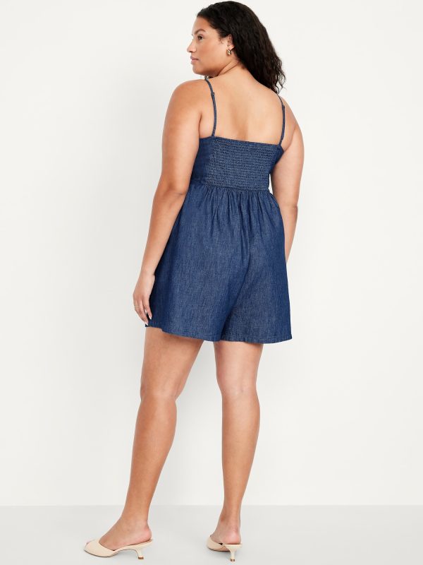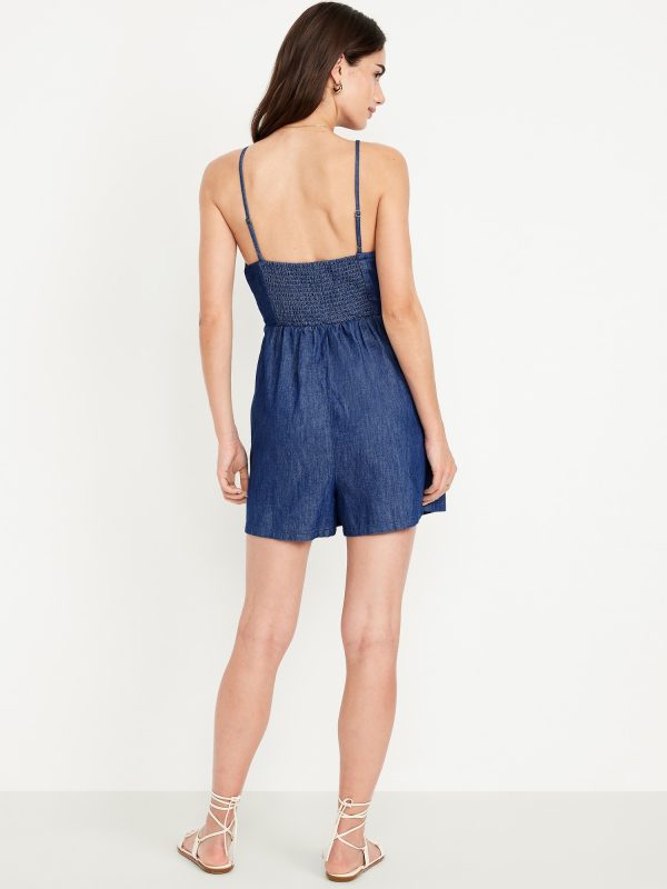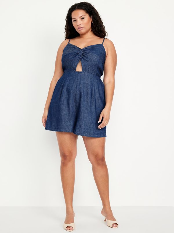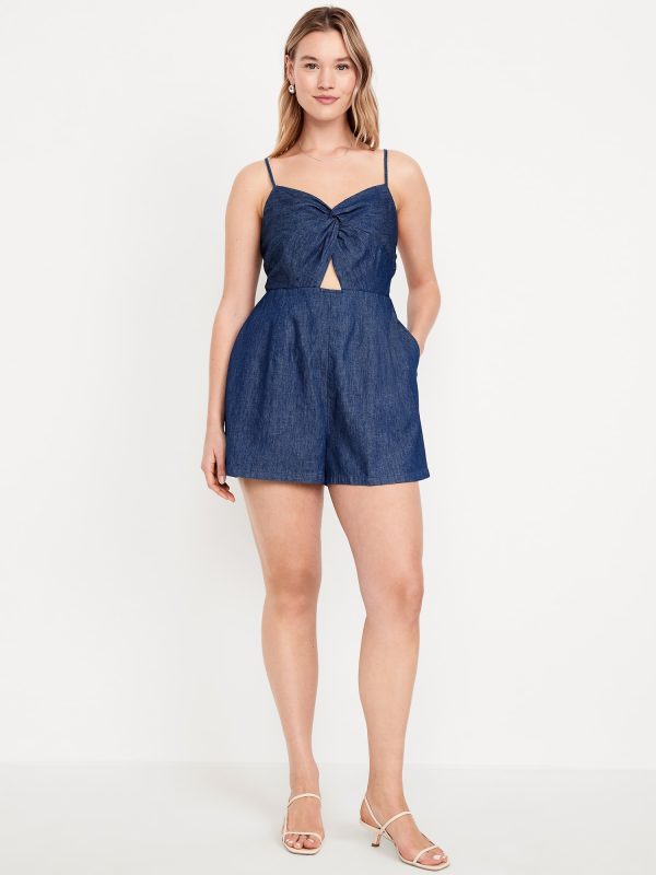 Fit & Flare Twist-Front Cami Romper: adjustable spaghetti straps, knotted keyhole front, on-seam pockets, smocked back, darted waist, #766930