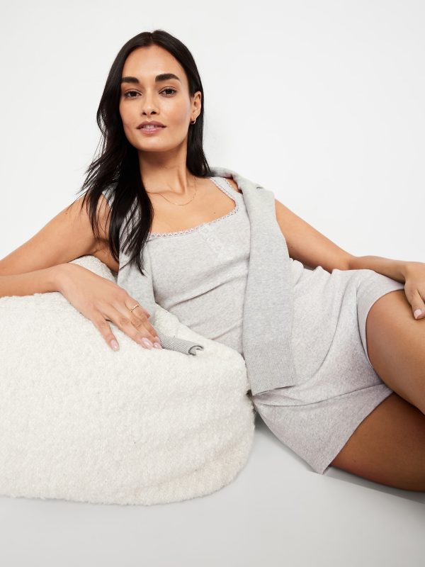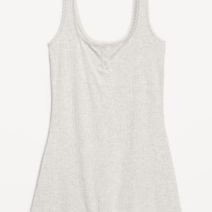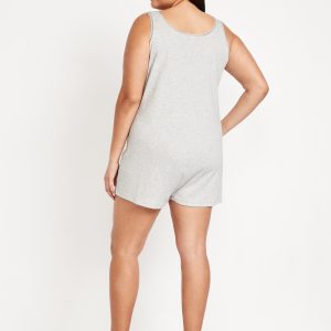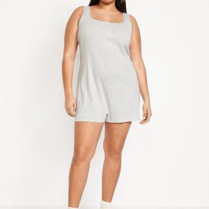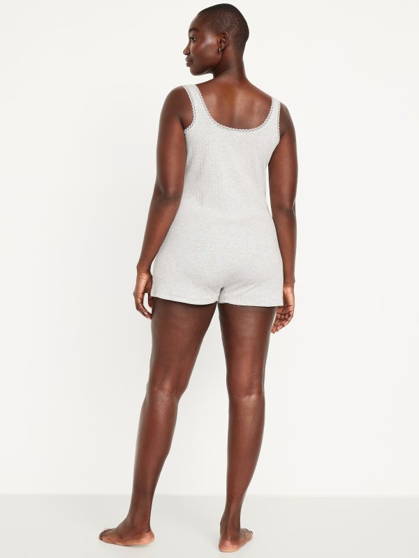 Fitted Pointelle Lace Pajama Romper: lace-trim square neck, wide straps, henley snap placket, #707444