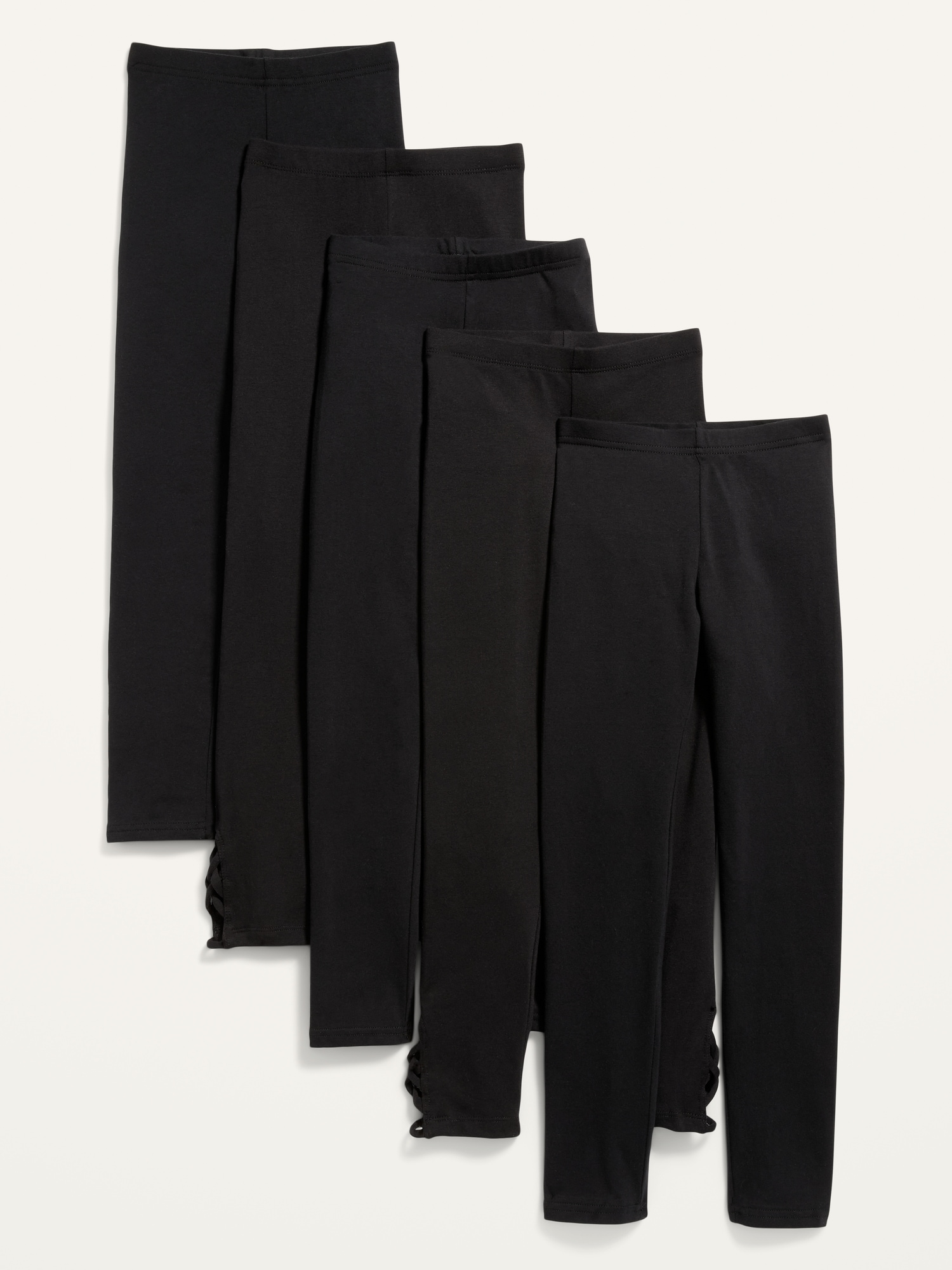 Full-Length Built-In Tough Leggings 5-Pack for Girls: Online exclusive!, Pack includes 5 pairs of leggings:, 3 pairs with regular hem., 2 pairs with lattice-hem detail., Elasticized waist., Soft-washed, lightweight jersey with comfortable stretch., Built-In Tough fabric has 2x the strength of regular leggings, which means they’re basically indestructible., Easy pull-on style., #842056