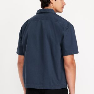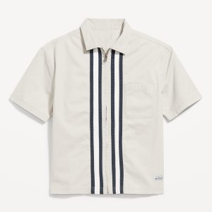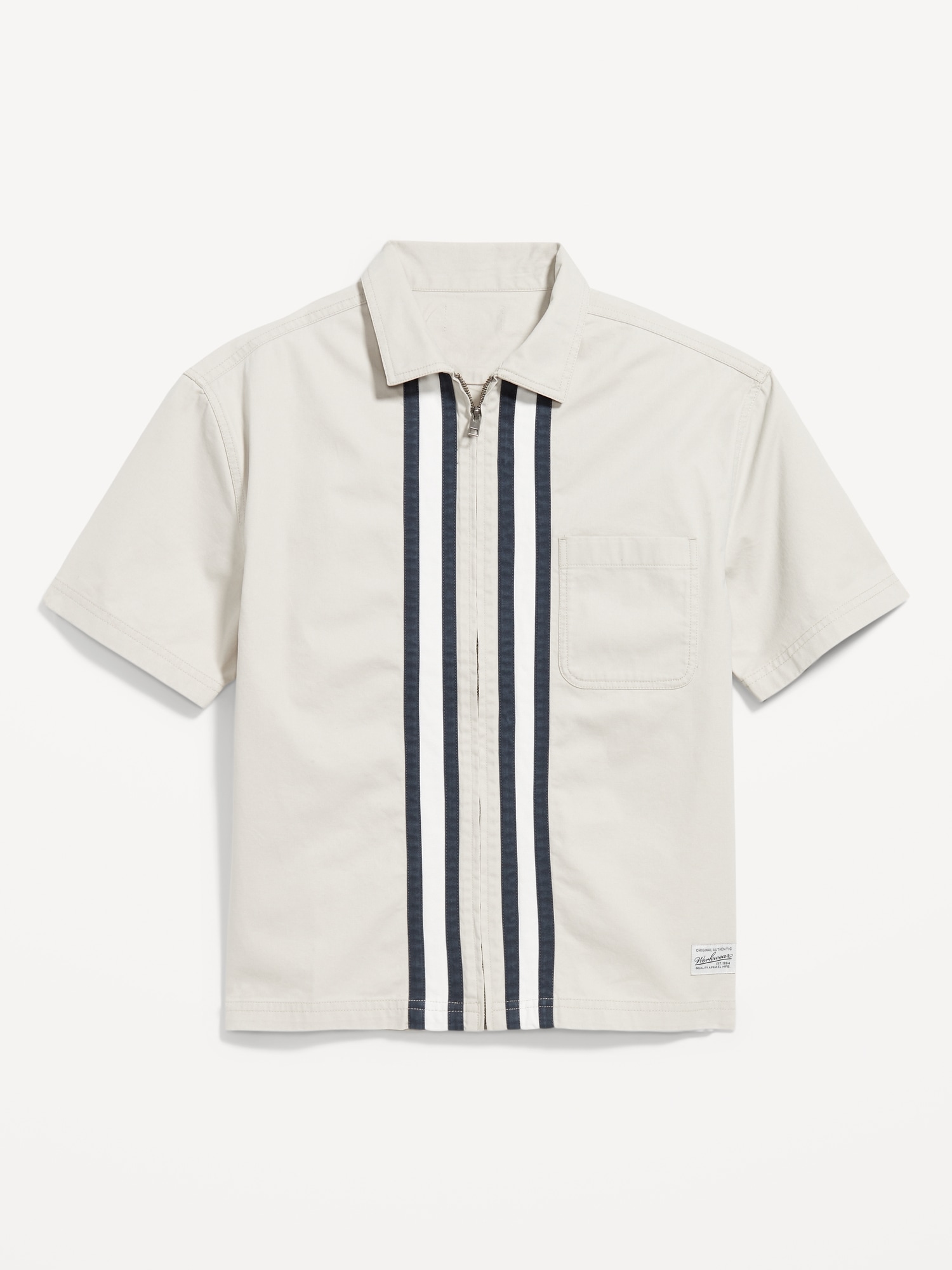 Full-Zip Moto Shirt: spread collar, short sleeves, zip front, patch chest pocket, contrasting stripes at center front, workwear patch at left hem, #778724