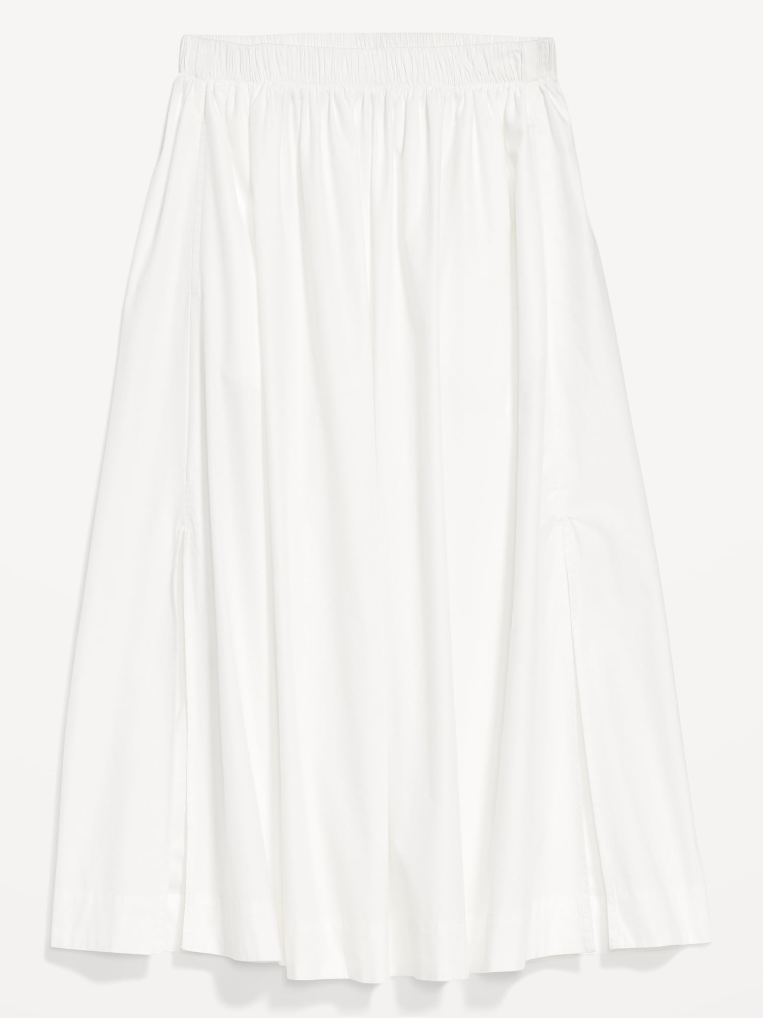 High-Waisted A-Line Midi Skirt: high elasticized waistband, side-seam pockets, striped print, #766934