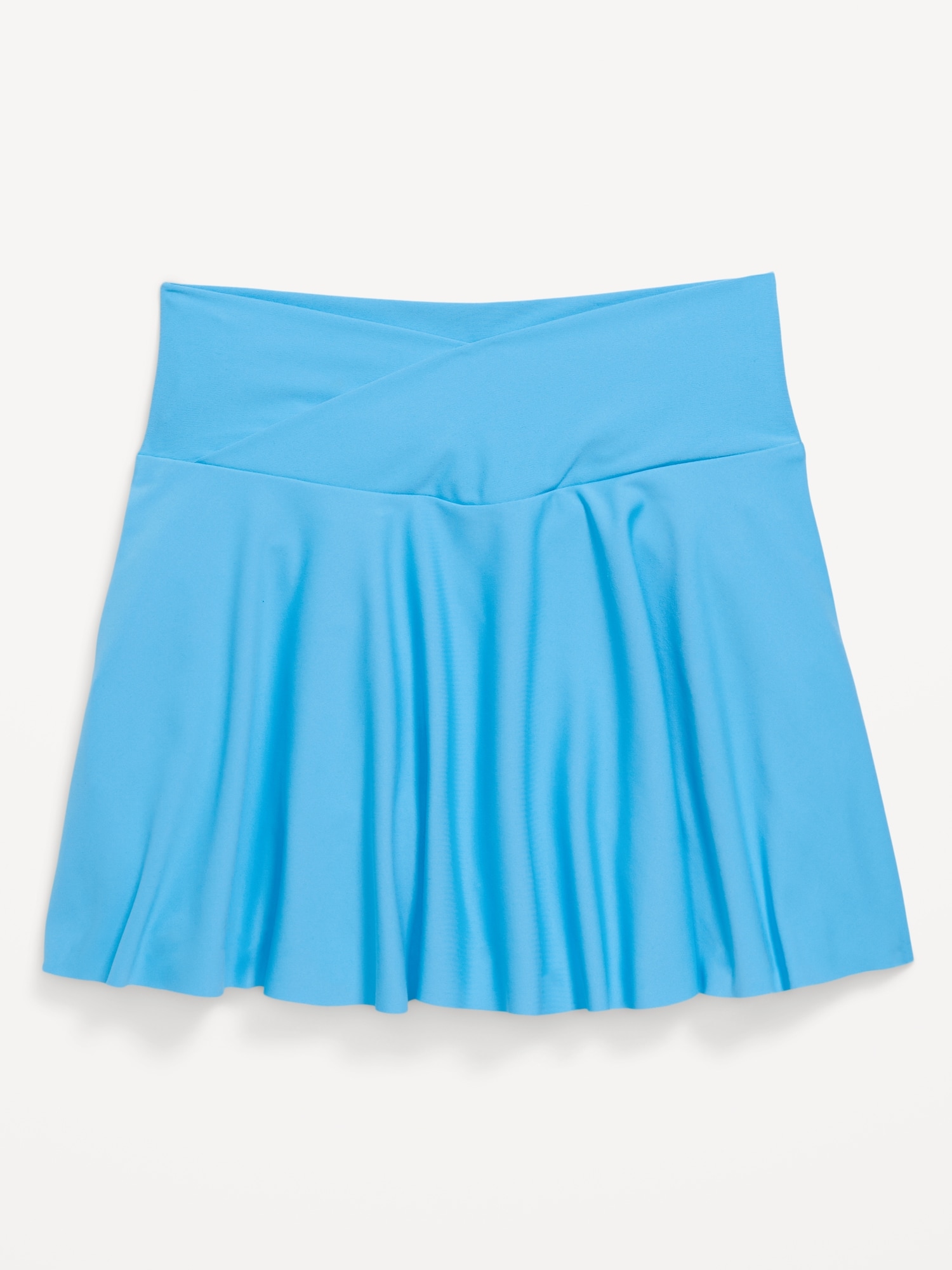 High-Waisted Crossover PowerSoft Skort for Girls: built-in biker shorts, high-rise, crossover elasticized waistband, mini-length skirt, side pocket on shorts, easy pull-on style, #696570