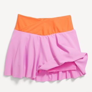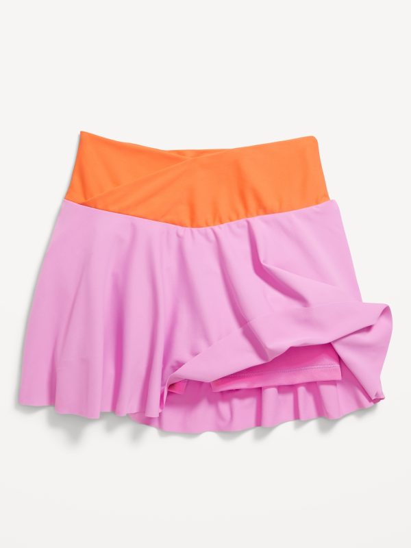 High-Waisted Crossover PowerSoft Skort for Girls: built-in biker shorts, high-rise, crossover elasticized waistband, mini-length skirt, side pocket on shorts, easy pull-on style, #696570