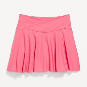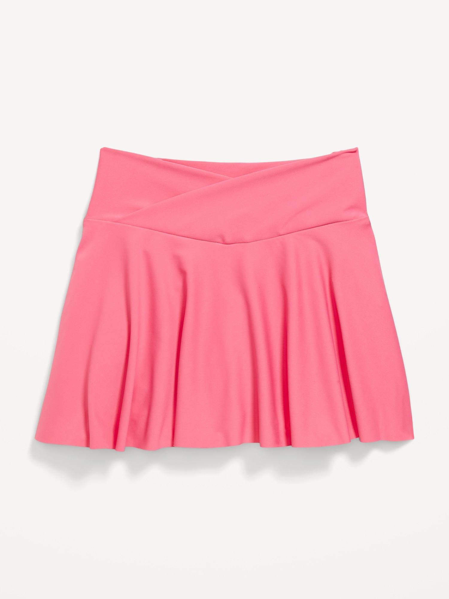 High-Waisted Crossover PowerSoft Skort for Girls: built-in biker shorts, high-rise, crossover elasticized waistband, mini-length skirt, side pocket on shorts, easy pull-on style, #696570